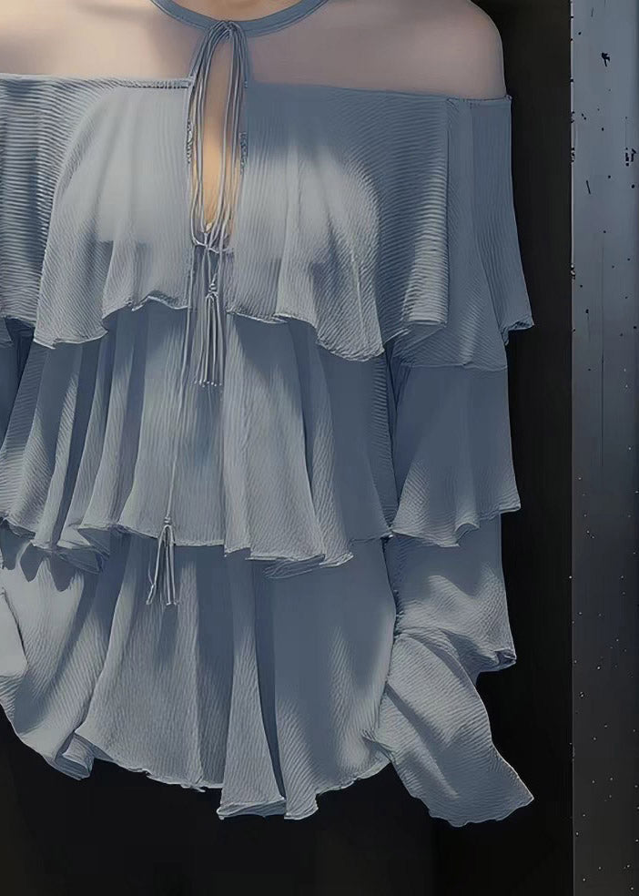Beautiful Blue O-Nec Ruffled Tulle Patchwork Chiffon Shirt Spring