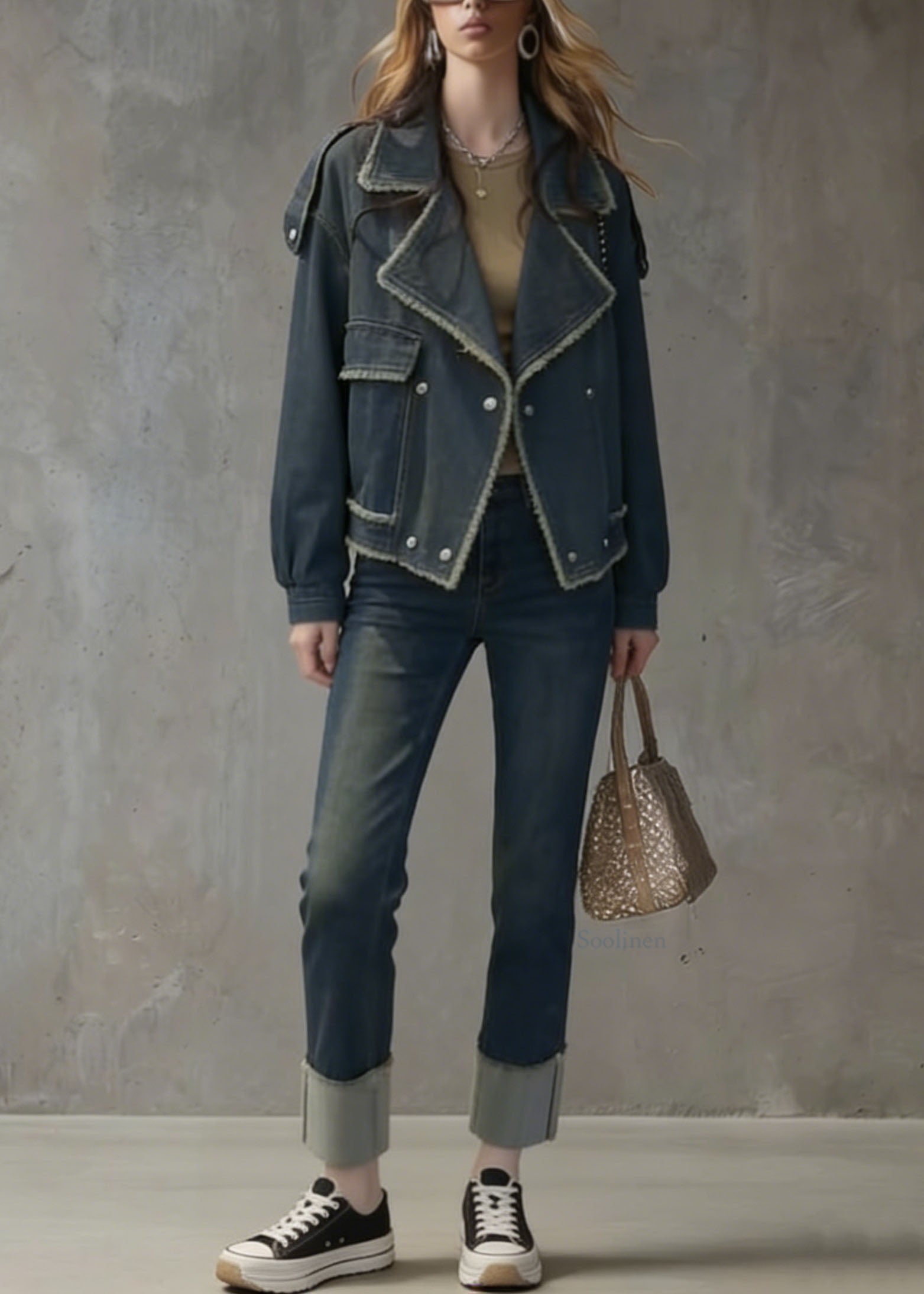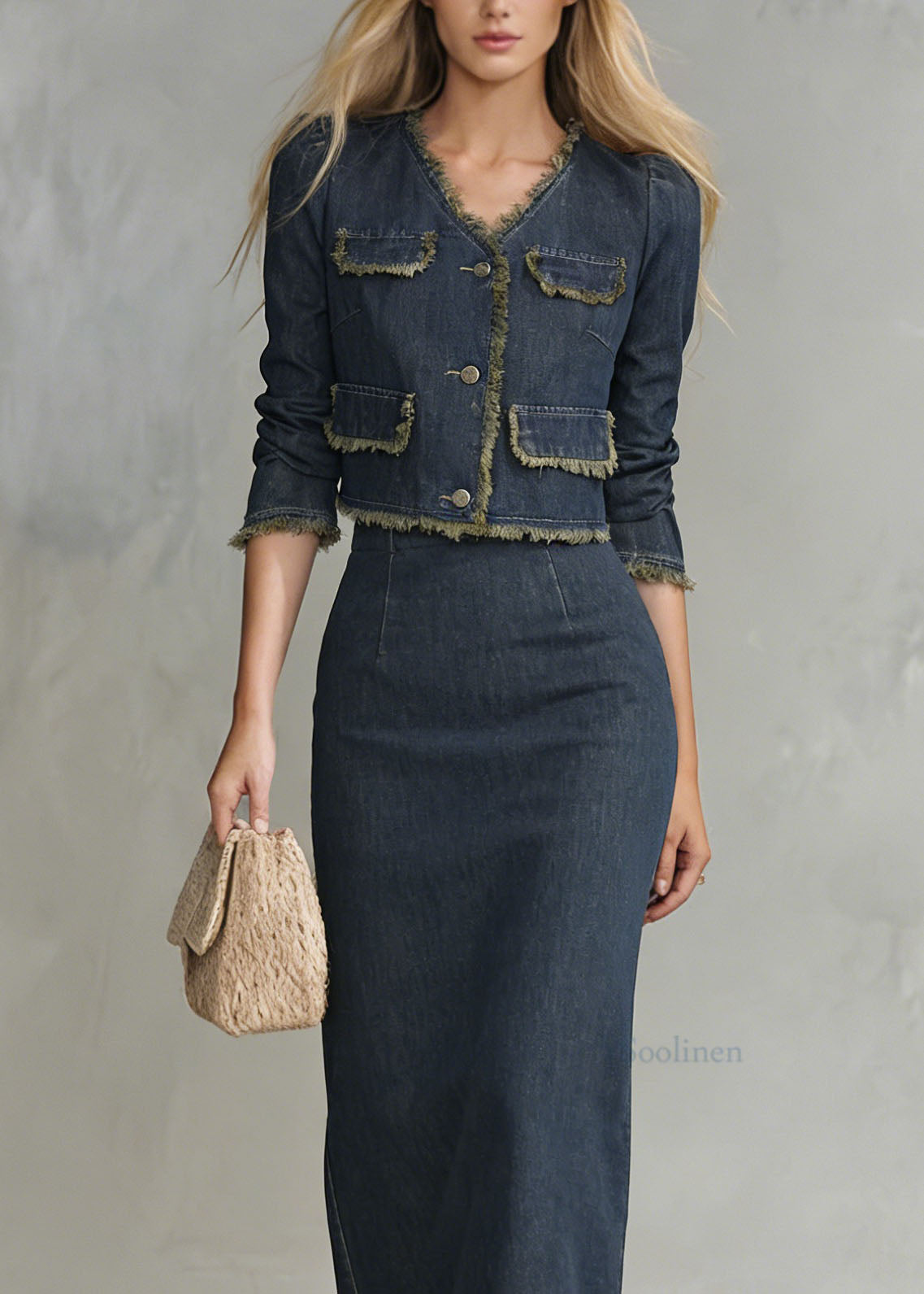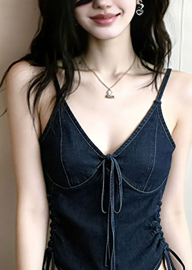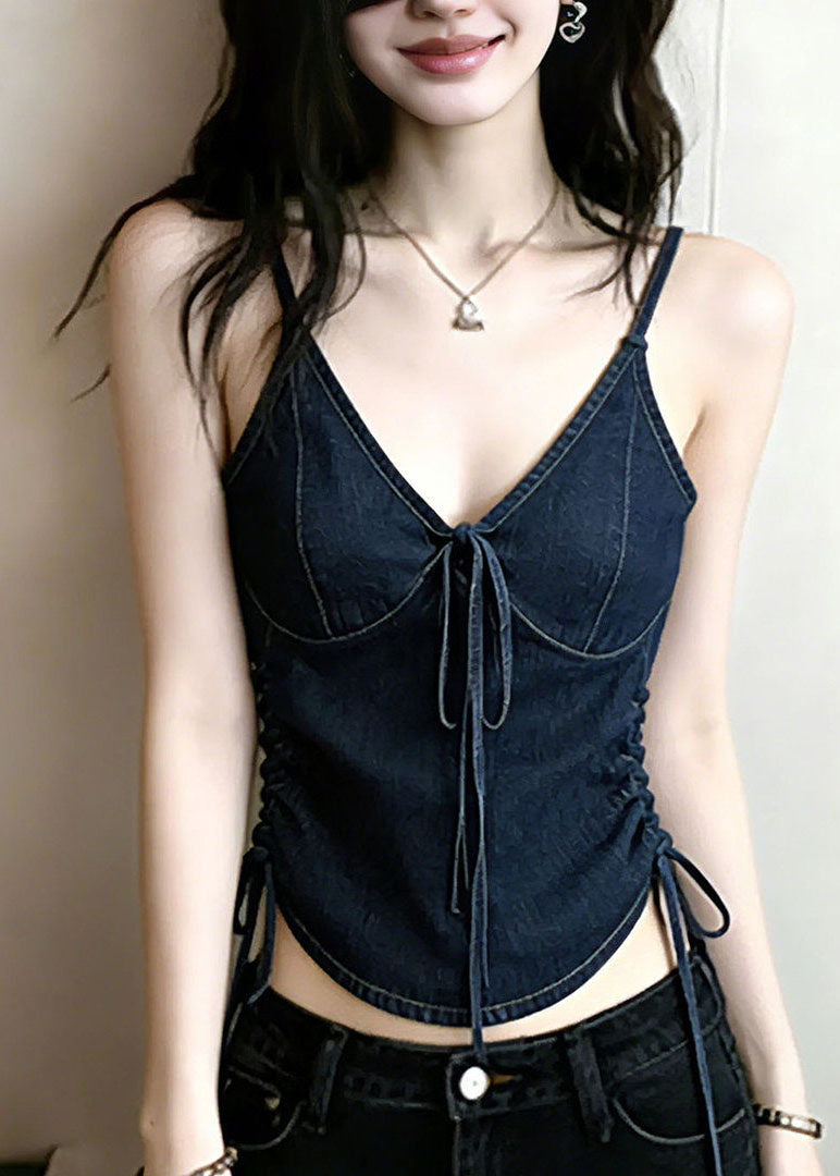 Stylish Navy V Neck Drawstring Denim Top Summer