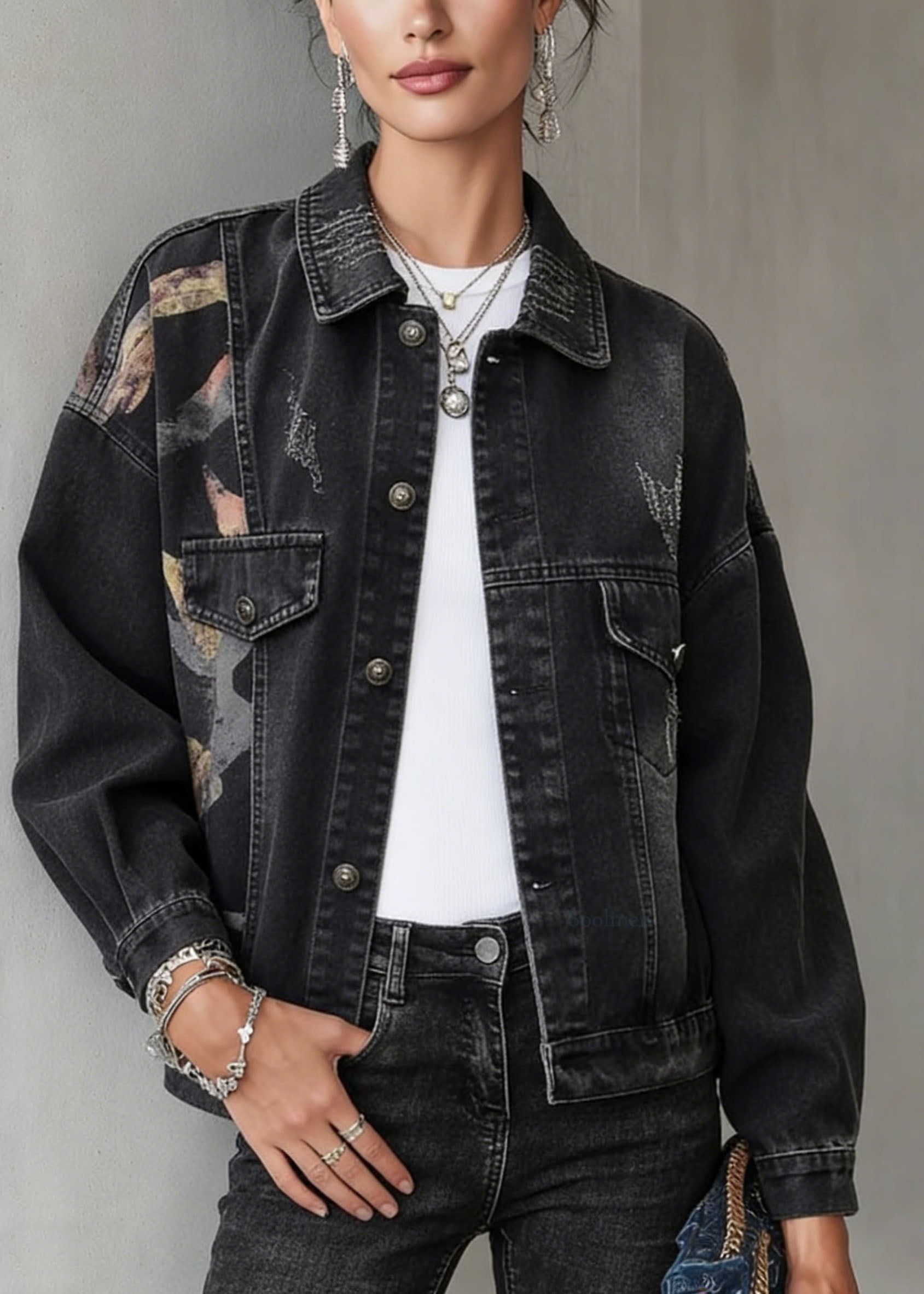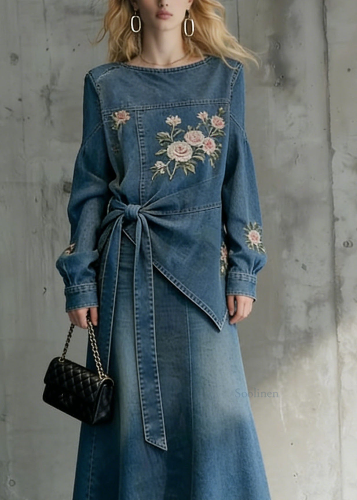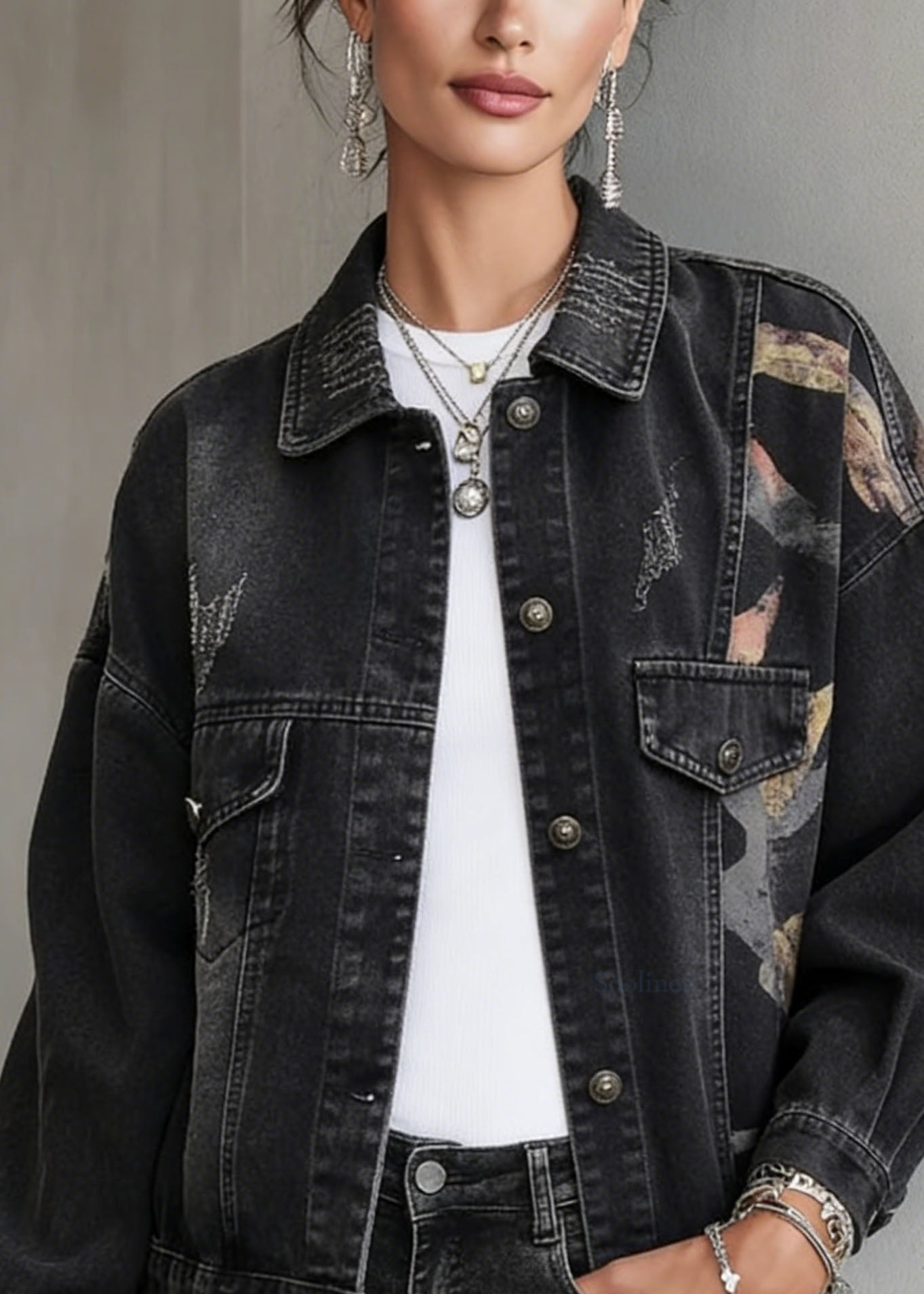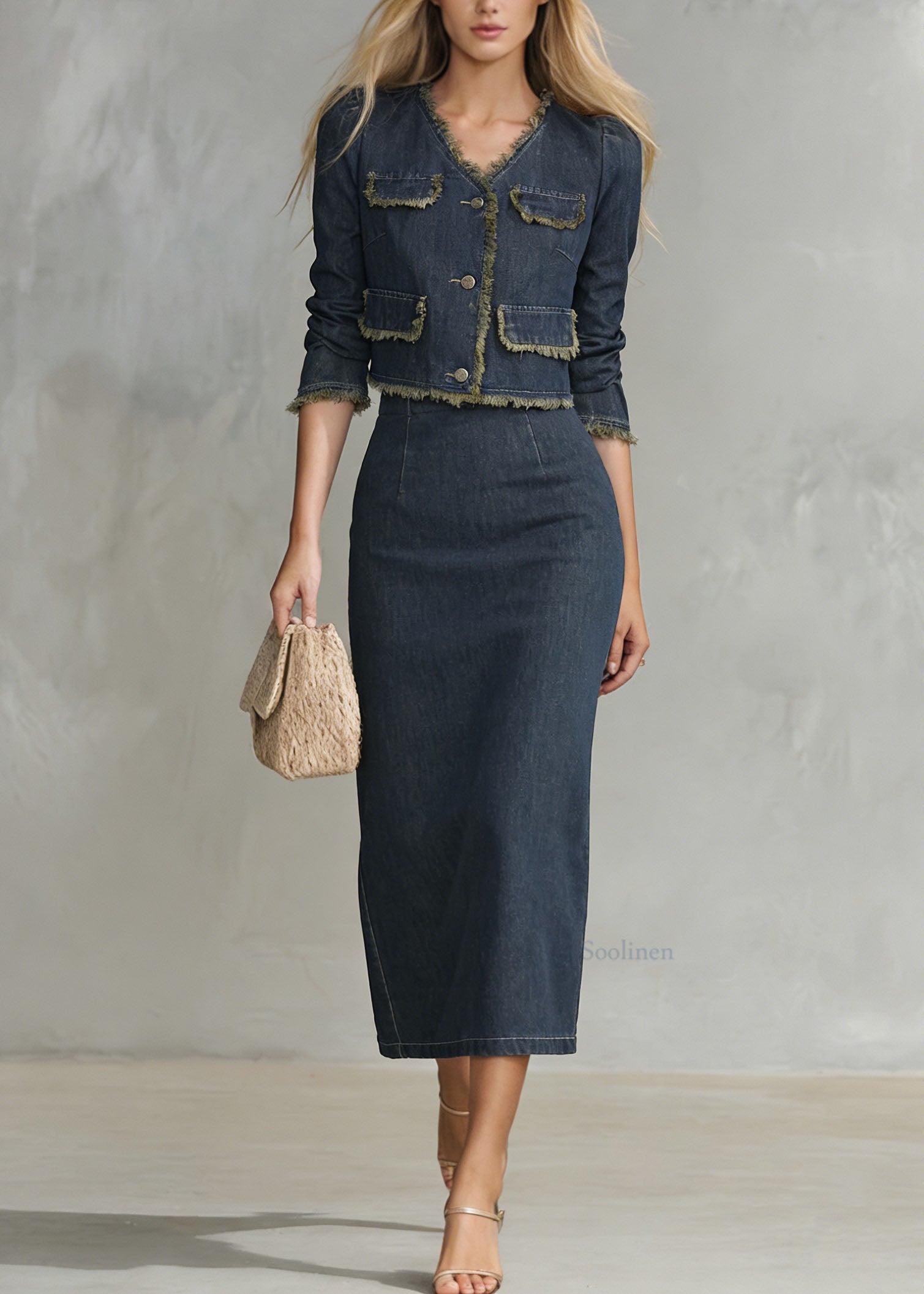 French Peter Pan Collar Print Pockets Denim Two Piece Suit Set Spring