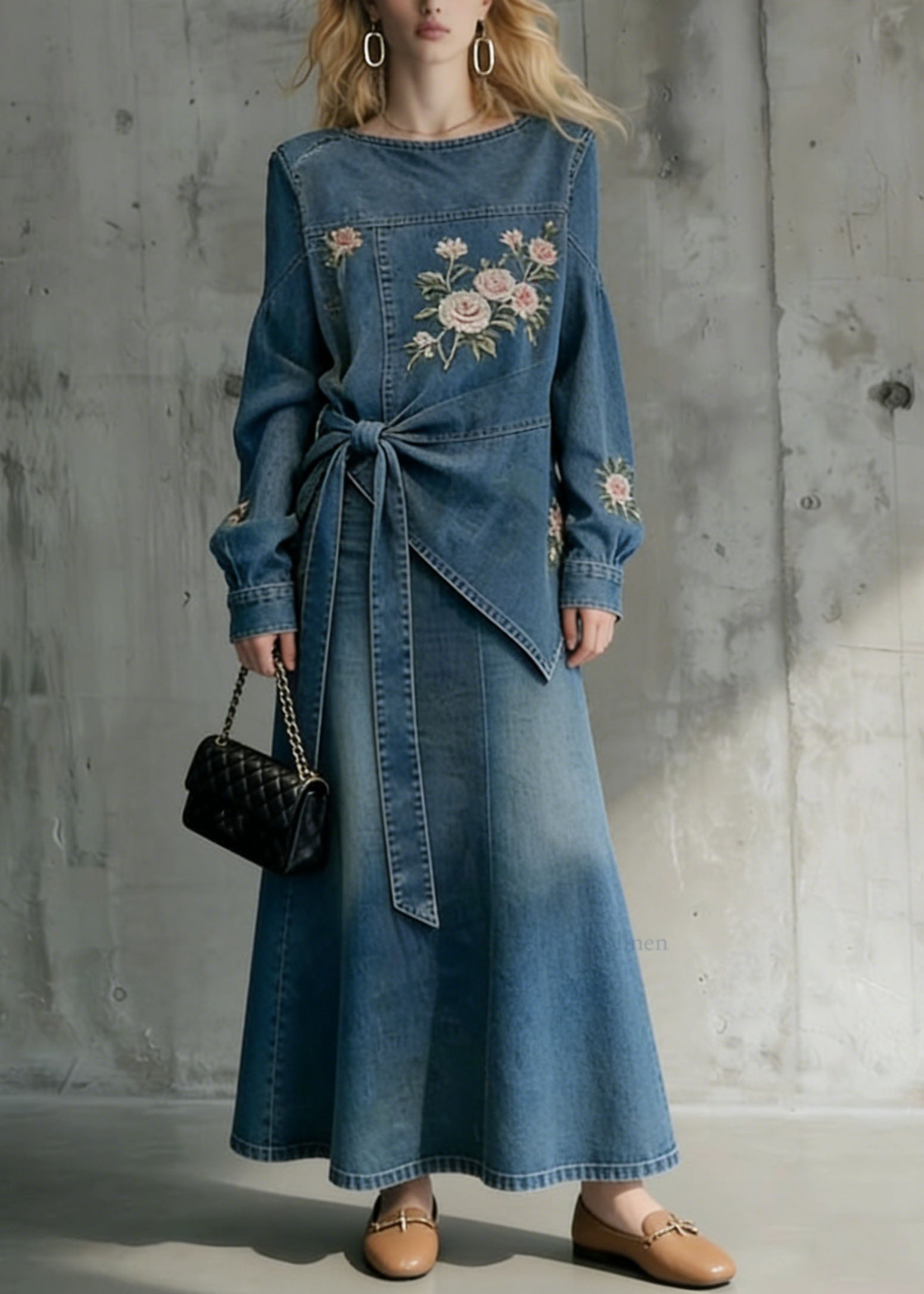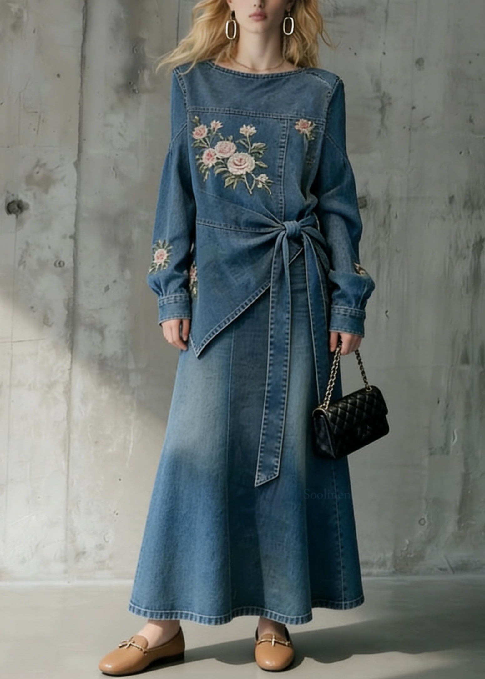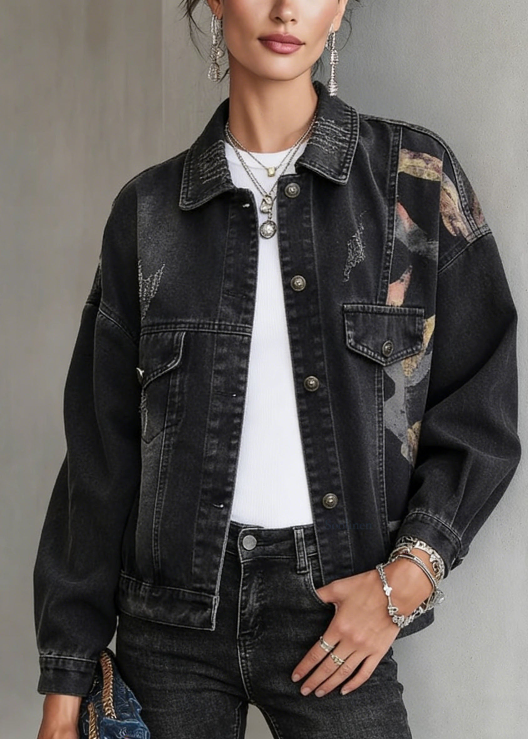 French Peter Pan Collar Print Pockets Denim Two Piece Suit Set Spring