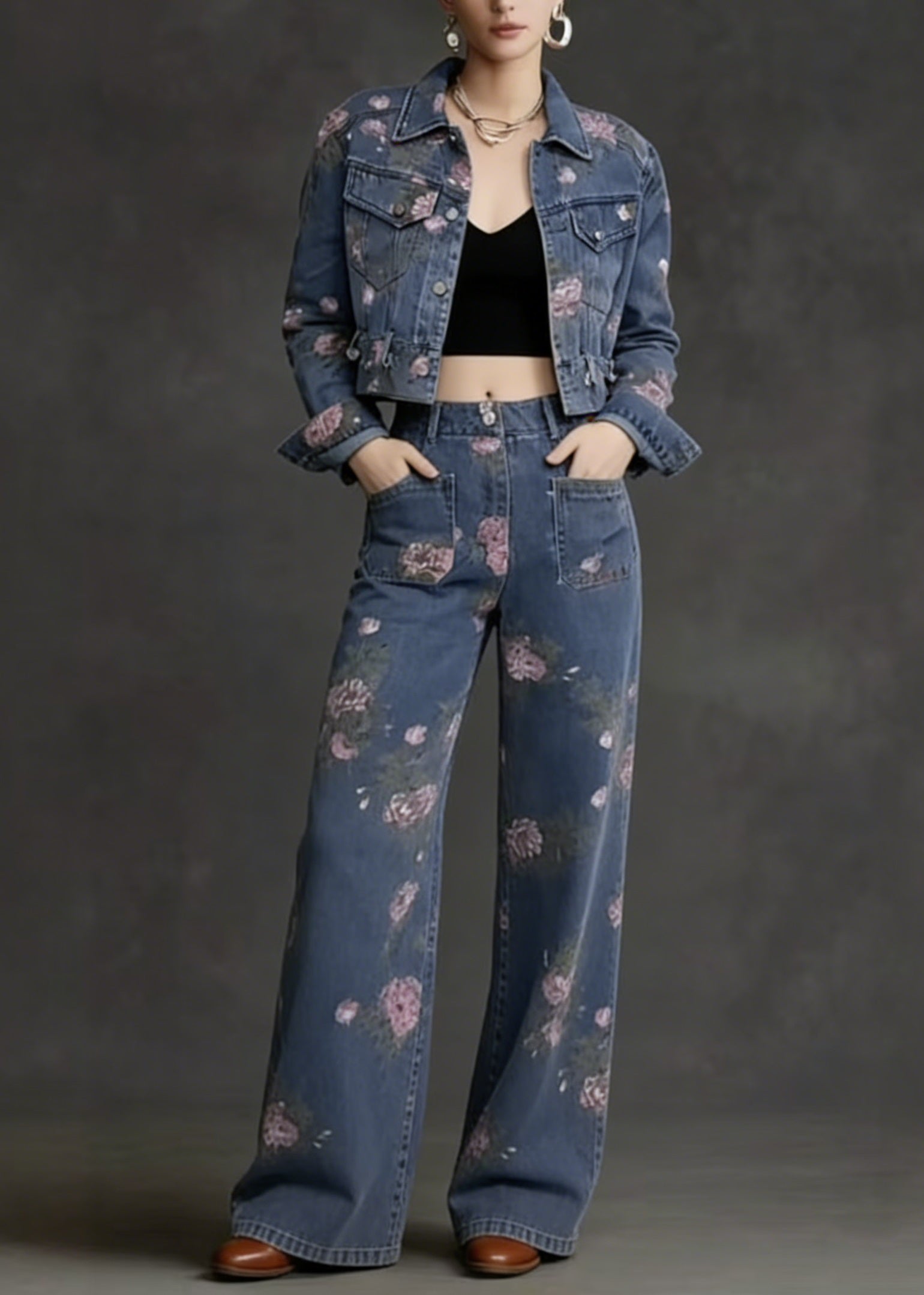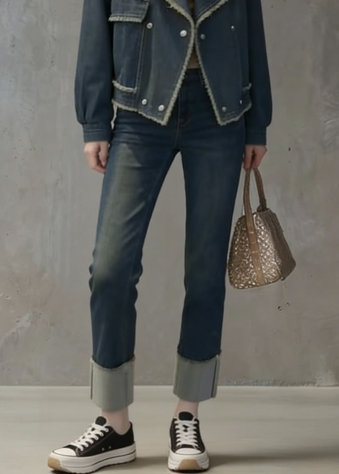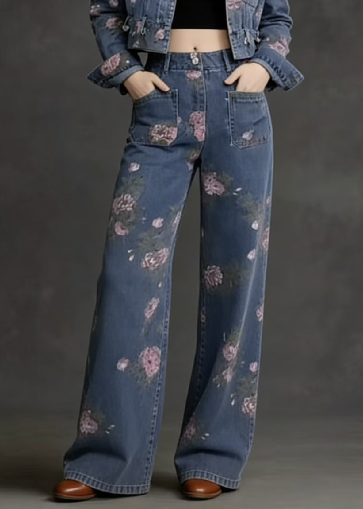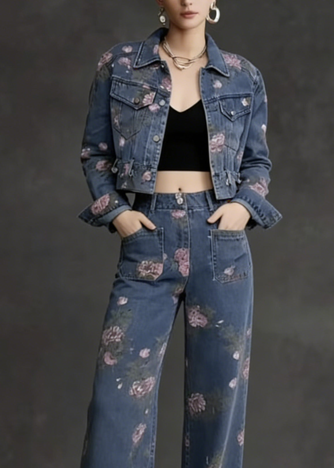 French Peter Pan Collar Print Pockets Denim Two Piece Suit Set Spring