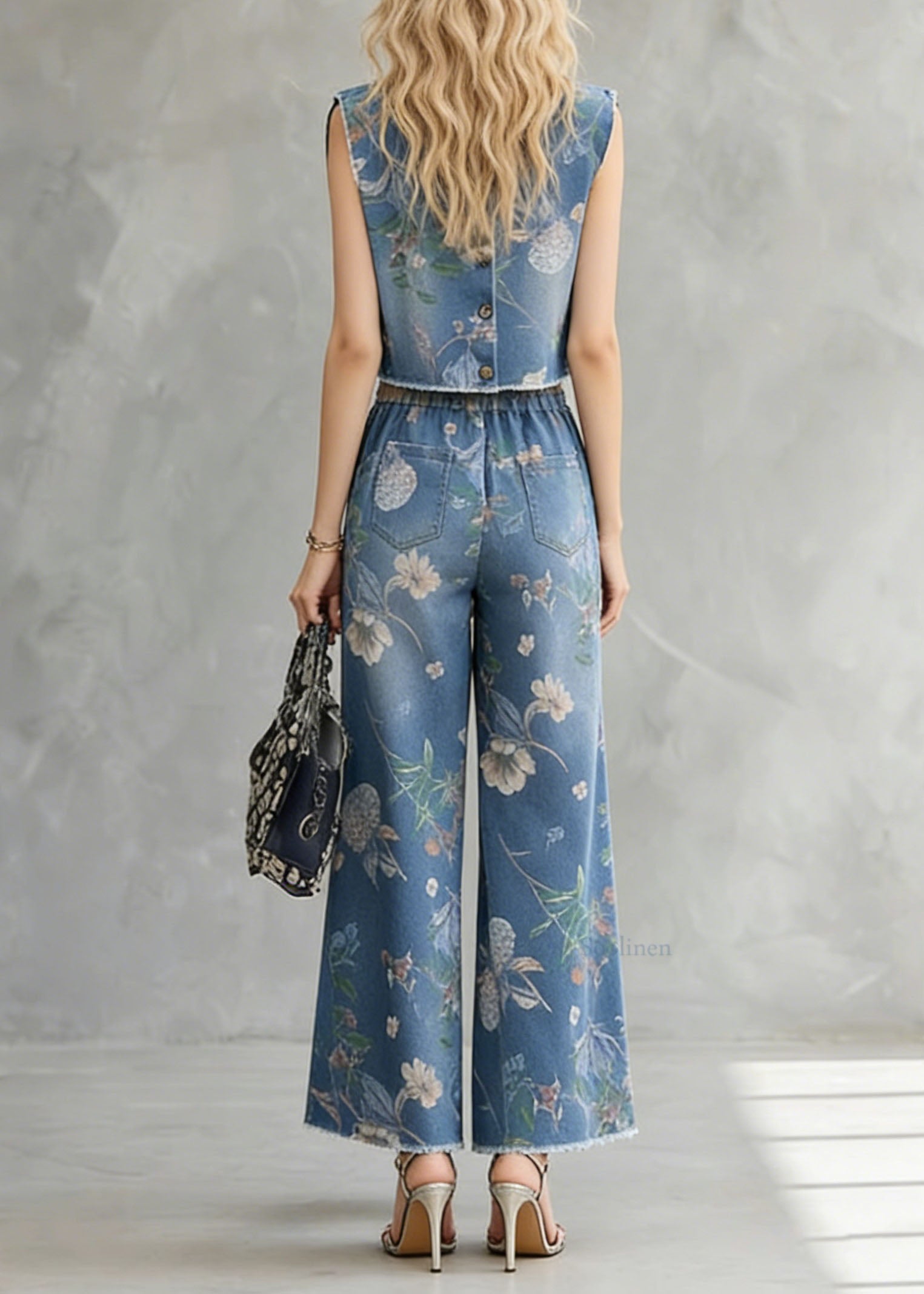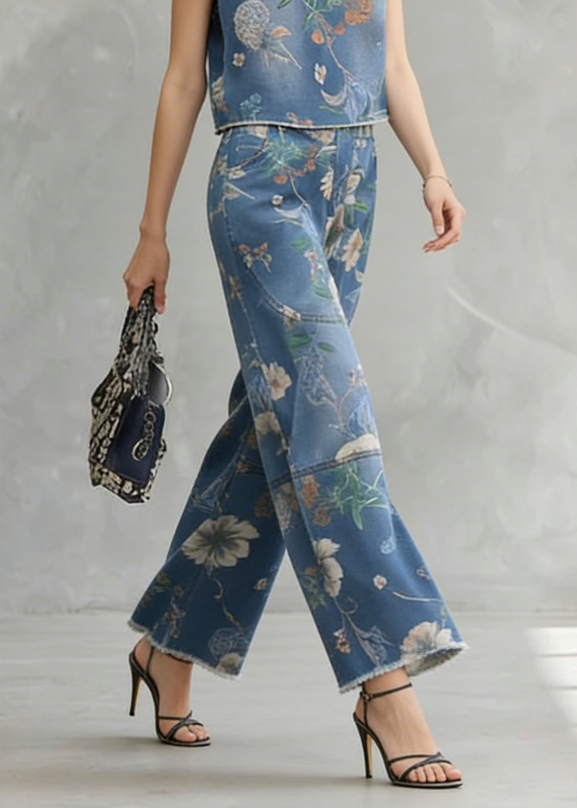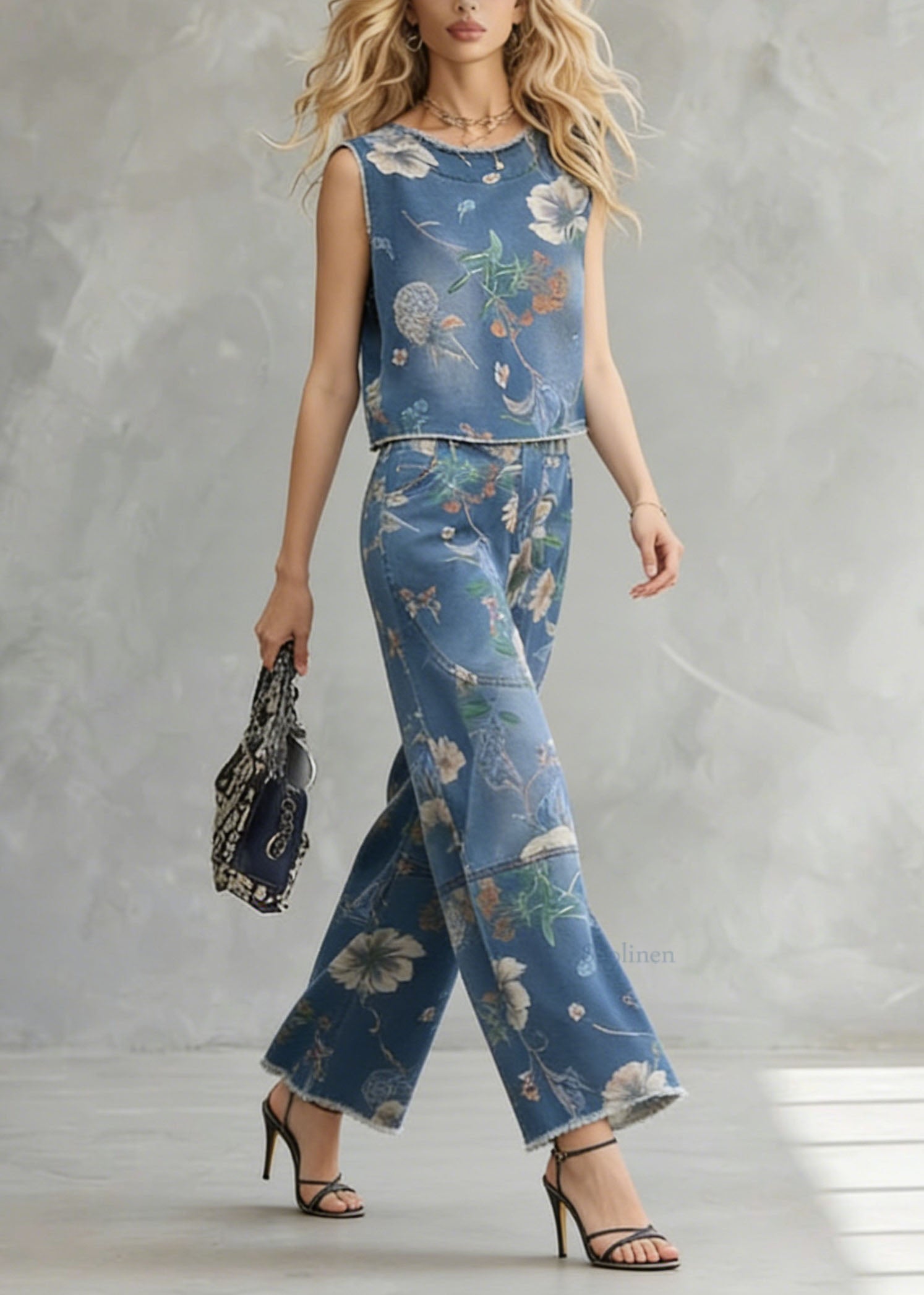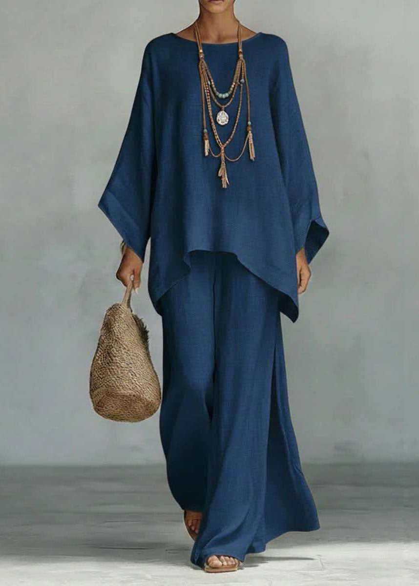 Blue Prints Vintage Chiffon Low High T Shirt And Wide Leg Pants Two Pieces