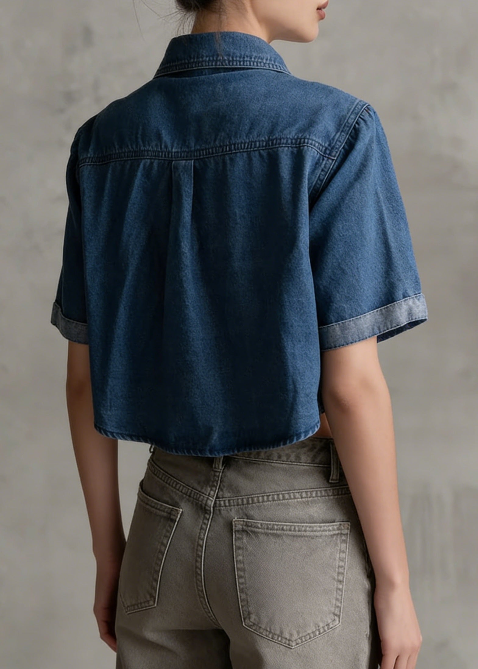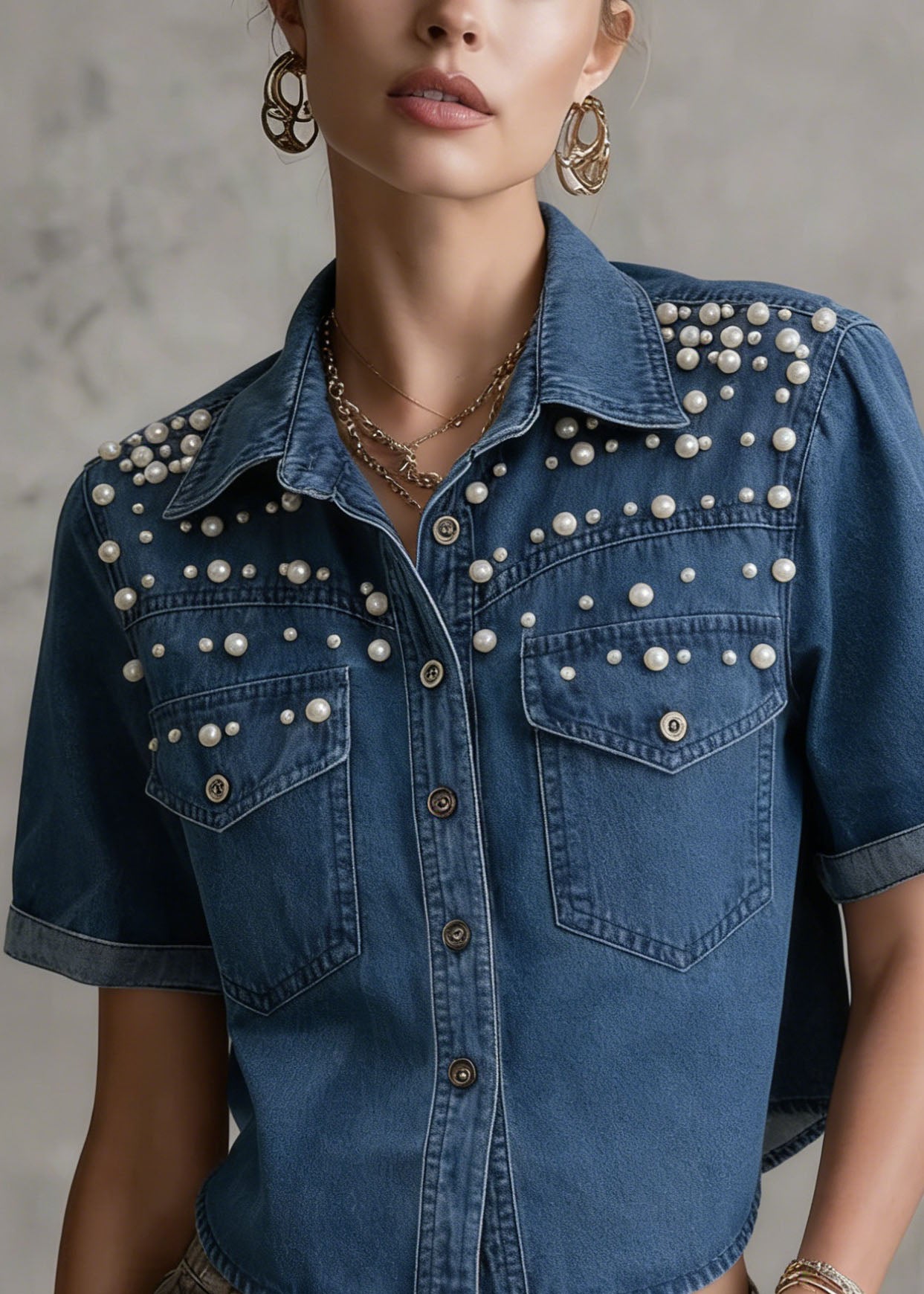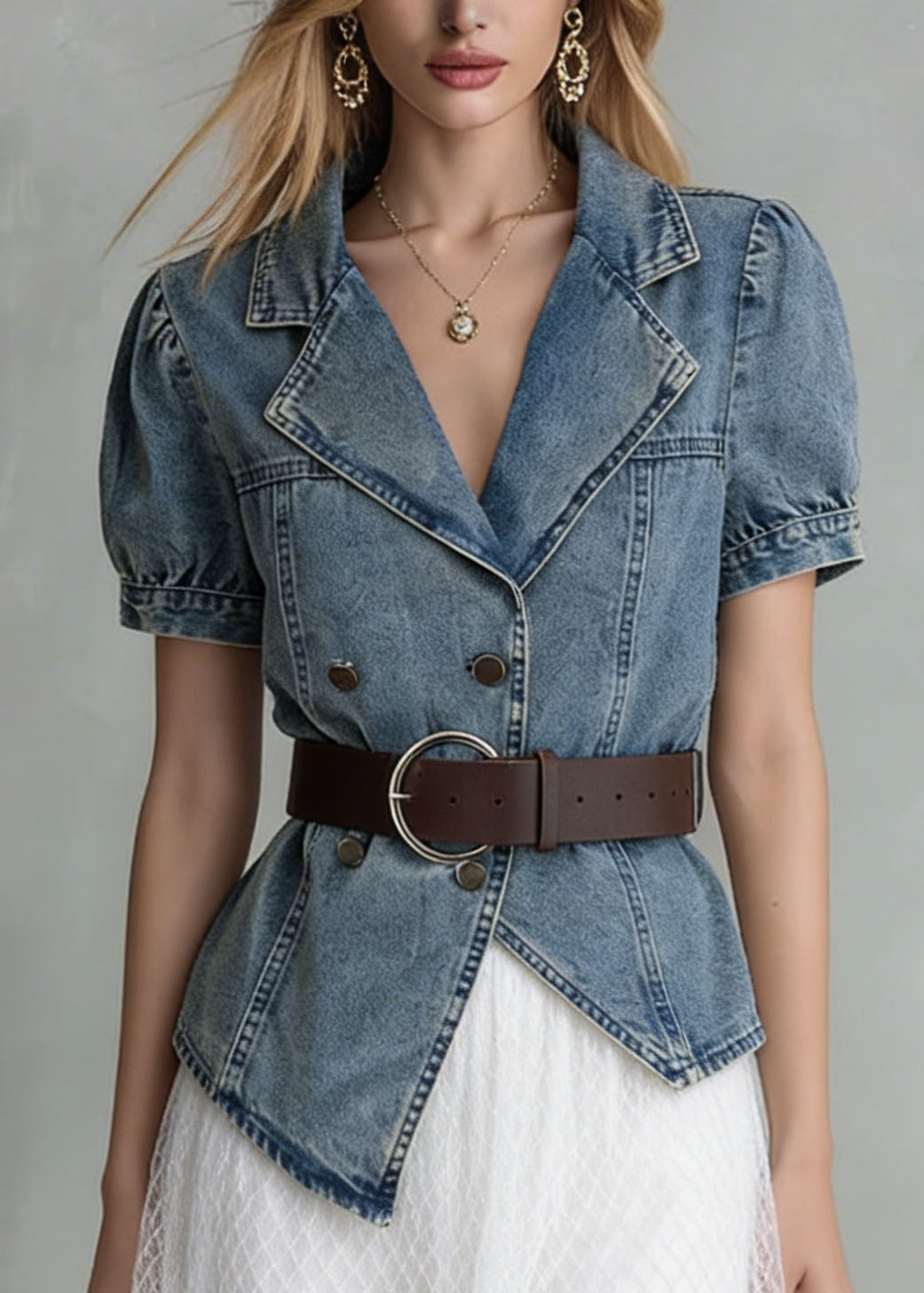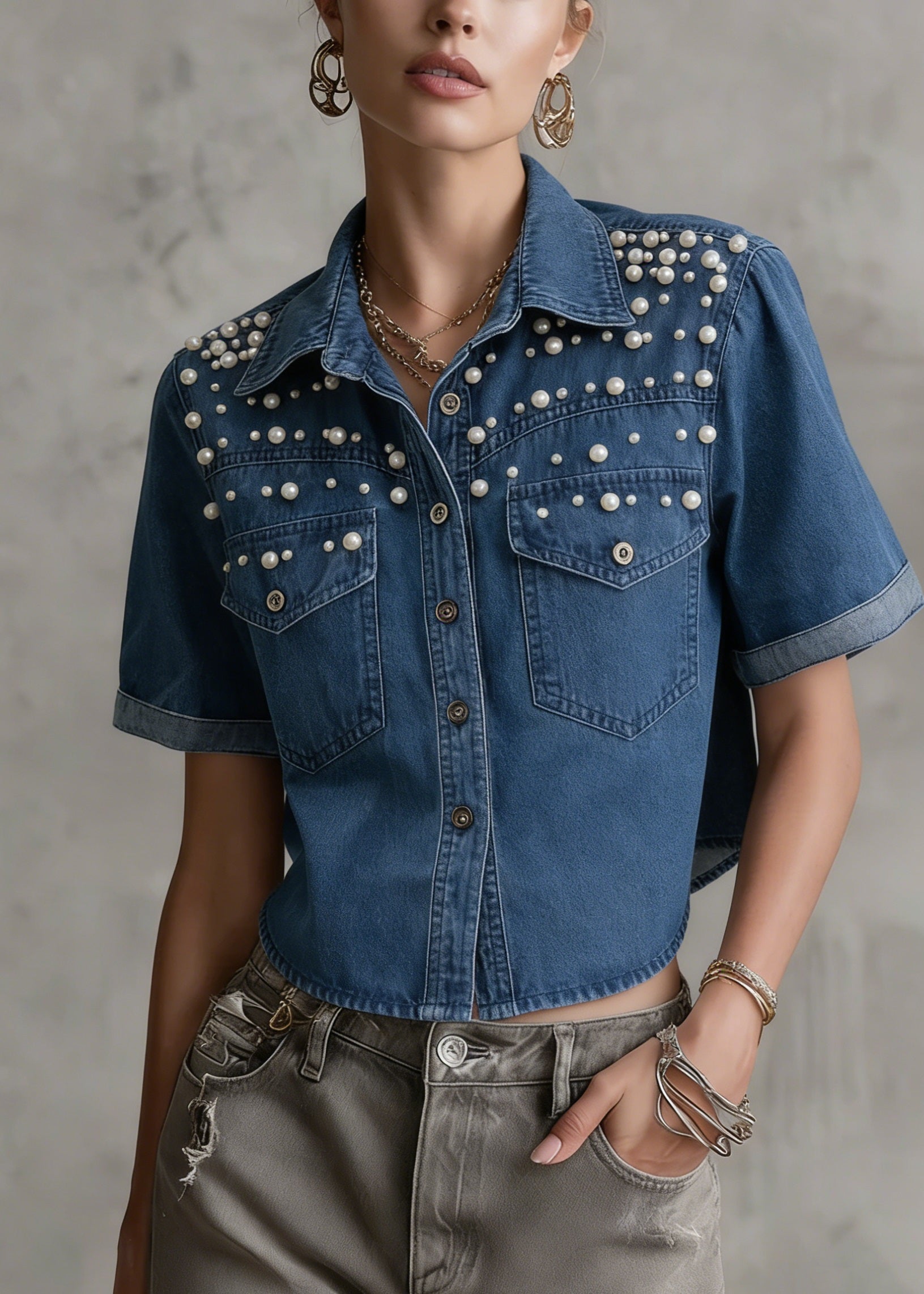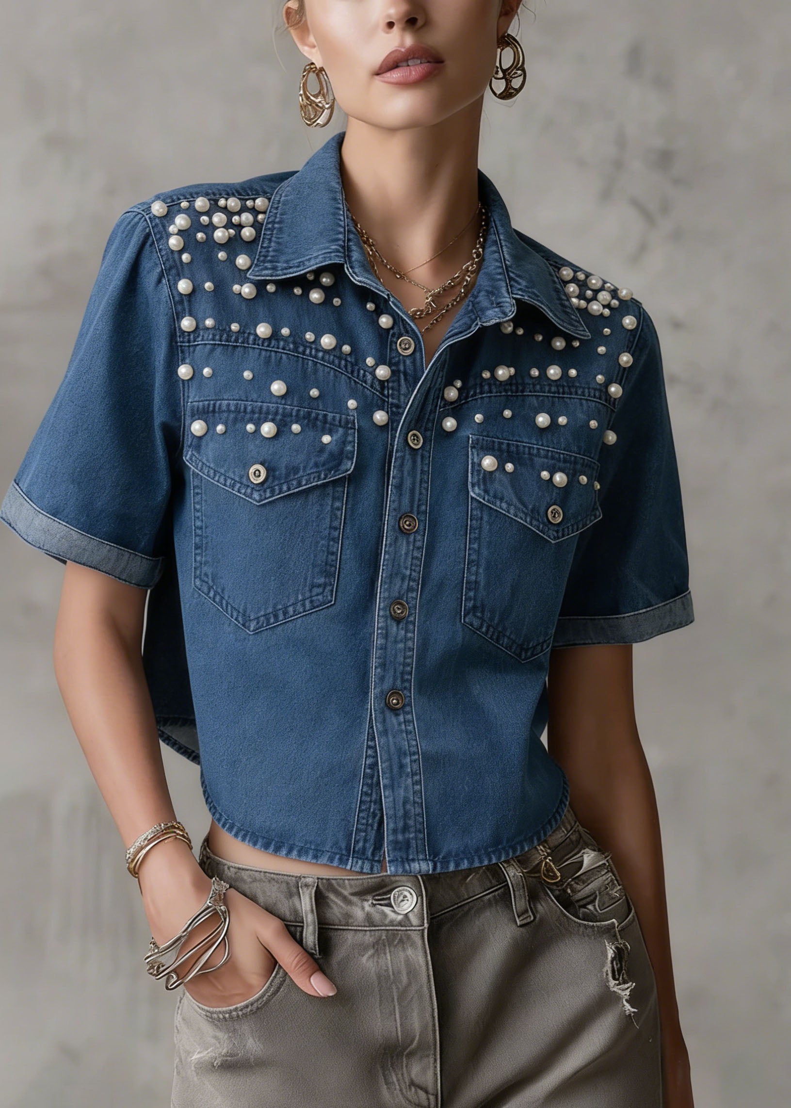 Boutique Blue Grey Chinese Button Denim Shirt Top Butterfly Sleeve