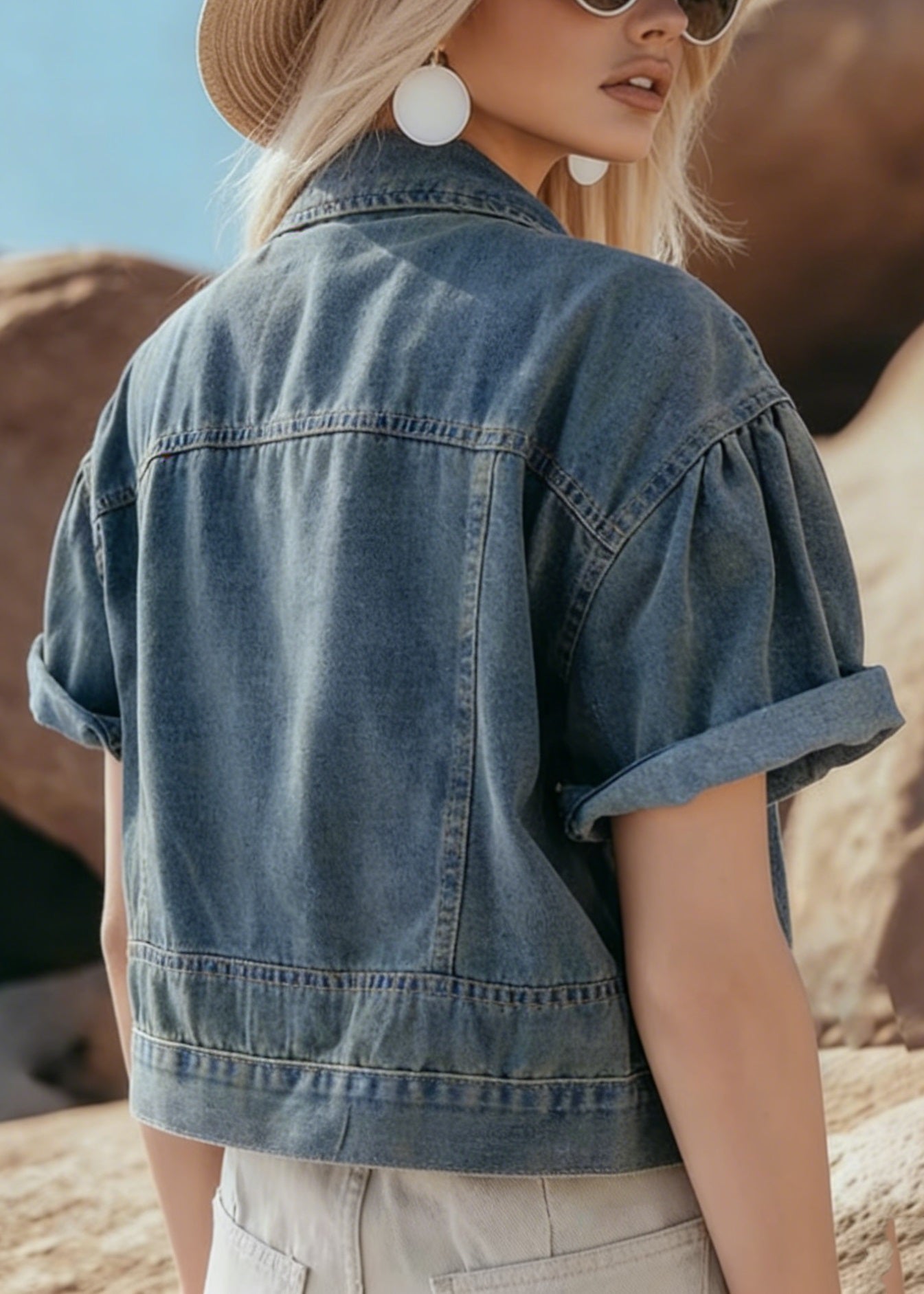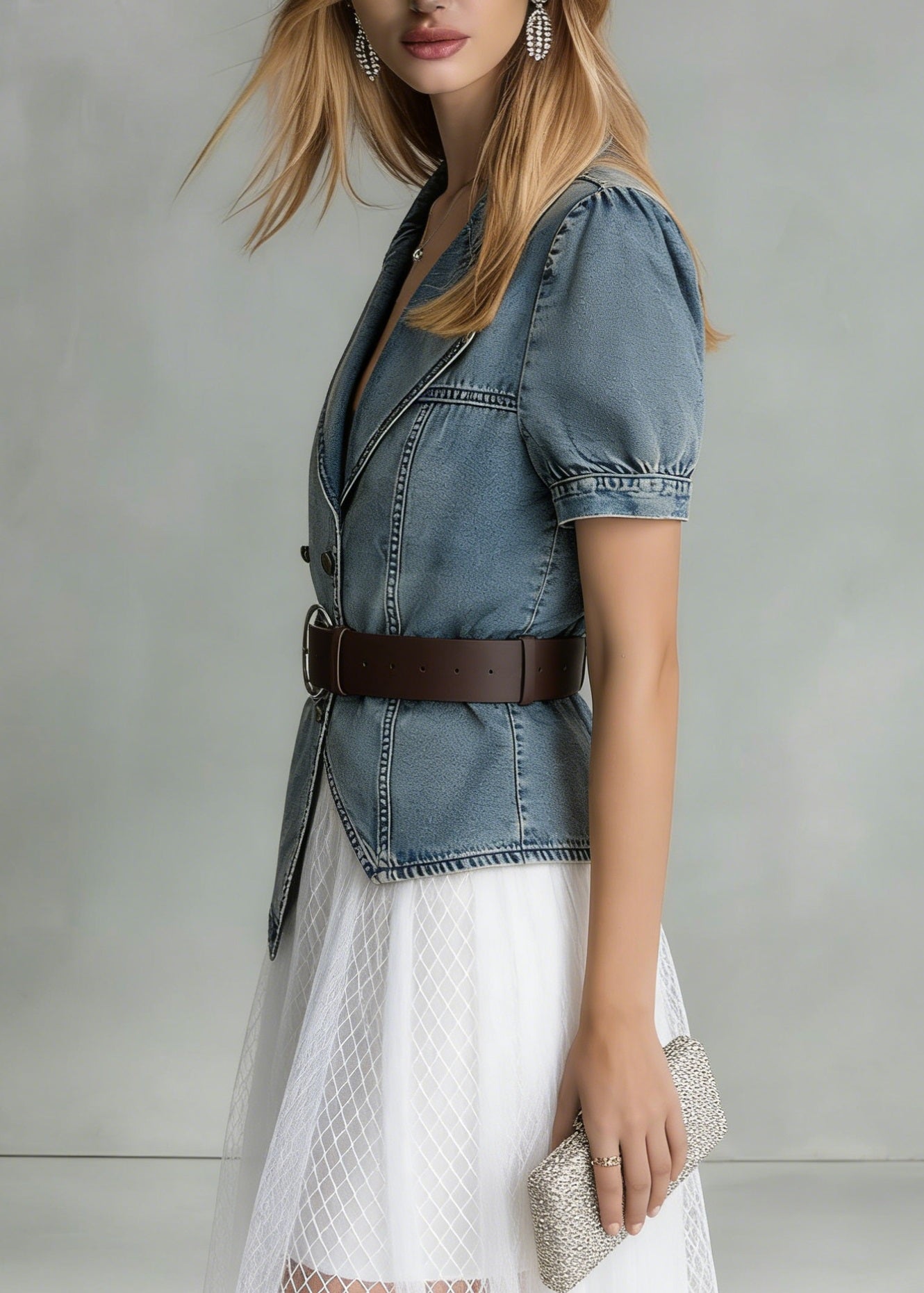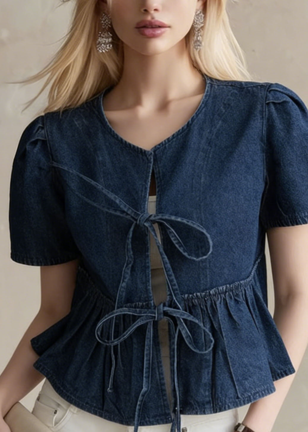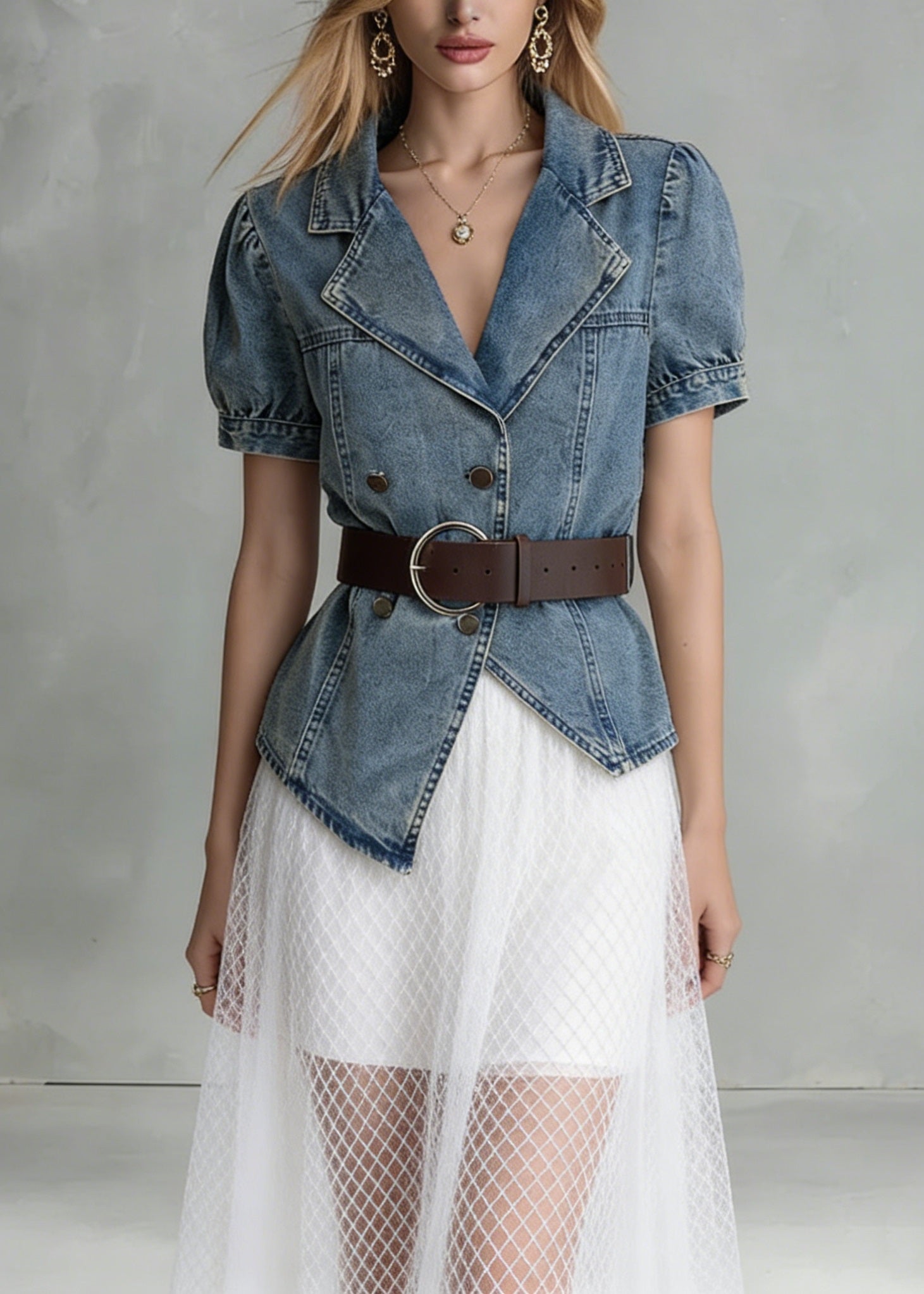 Boutique Blue Grey Chinese Button Denim Shirt Top Butterfly Sleeve