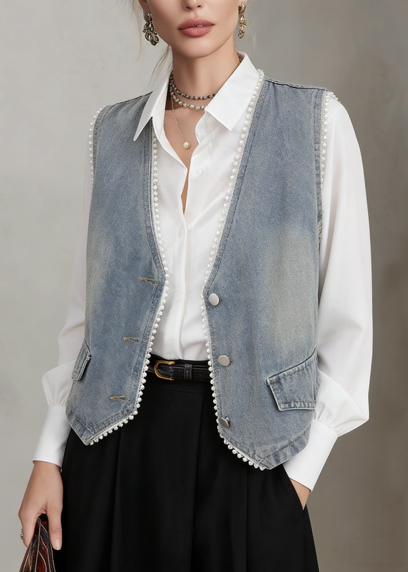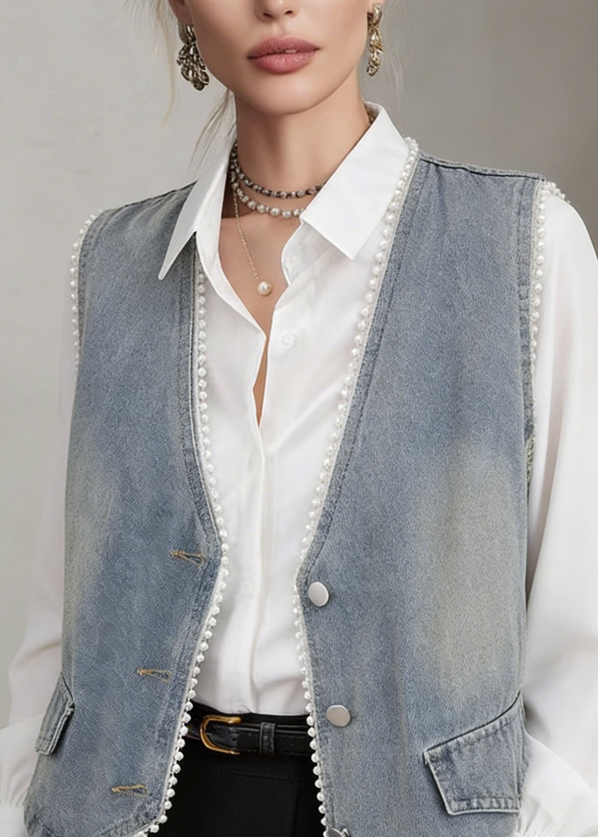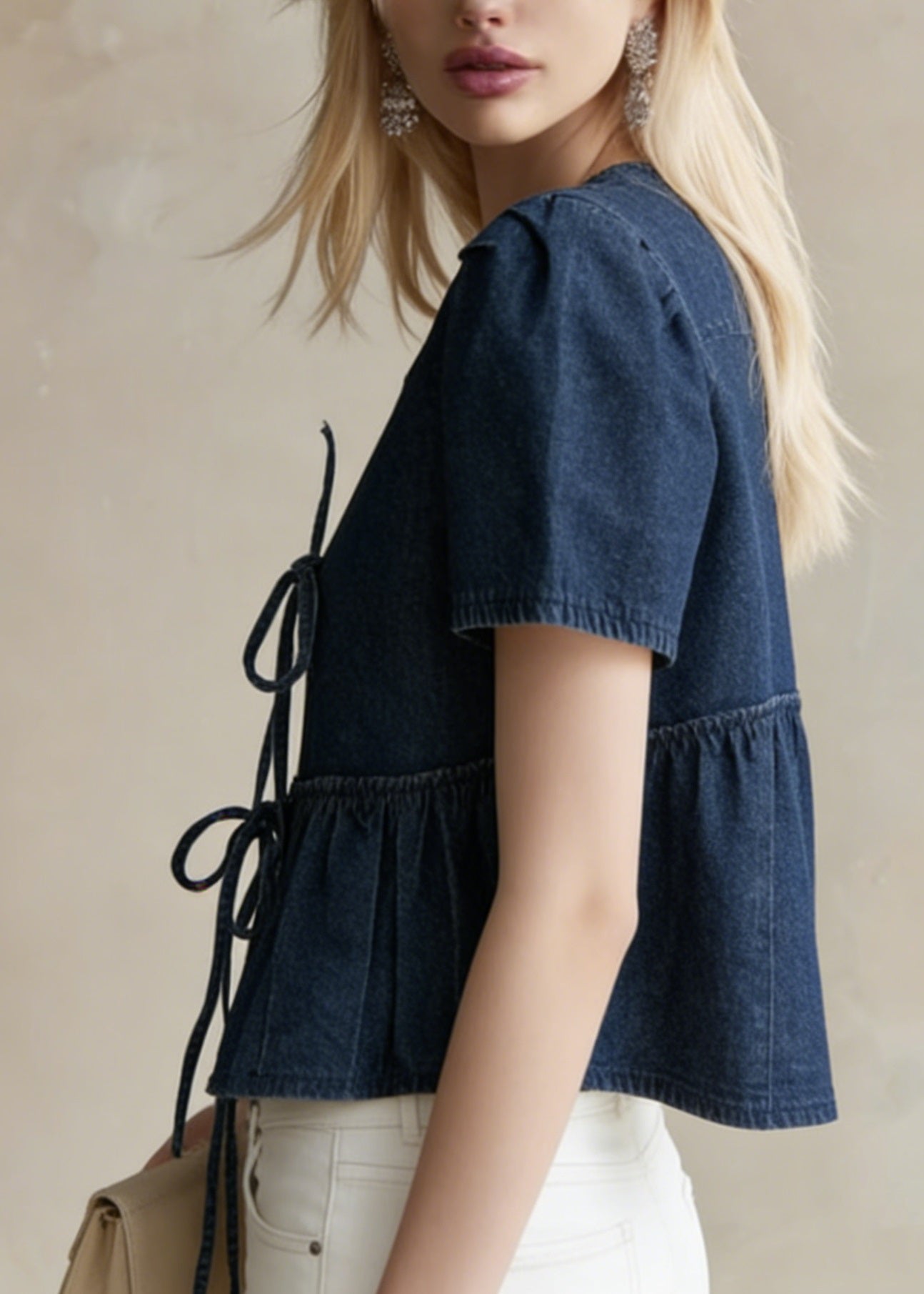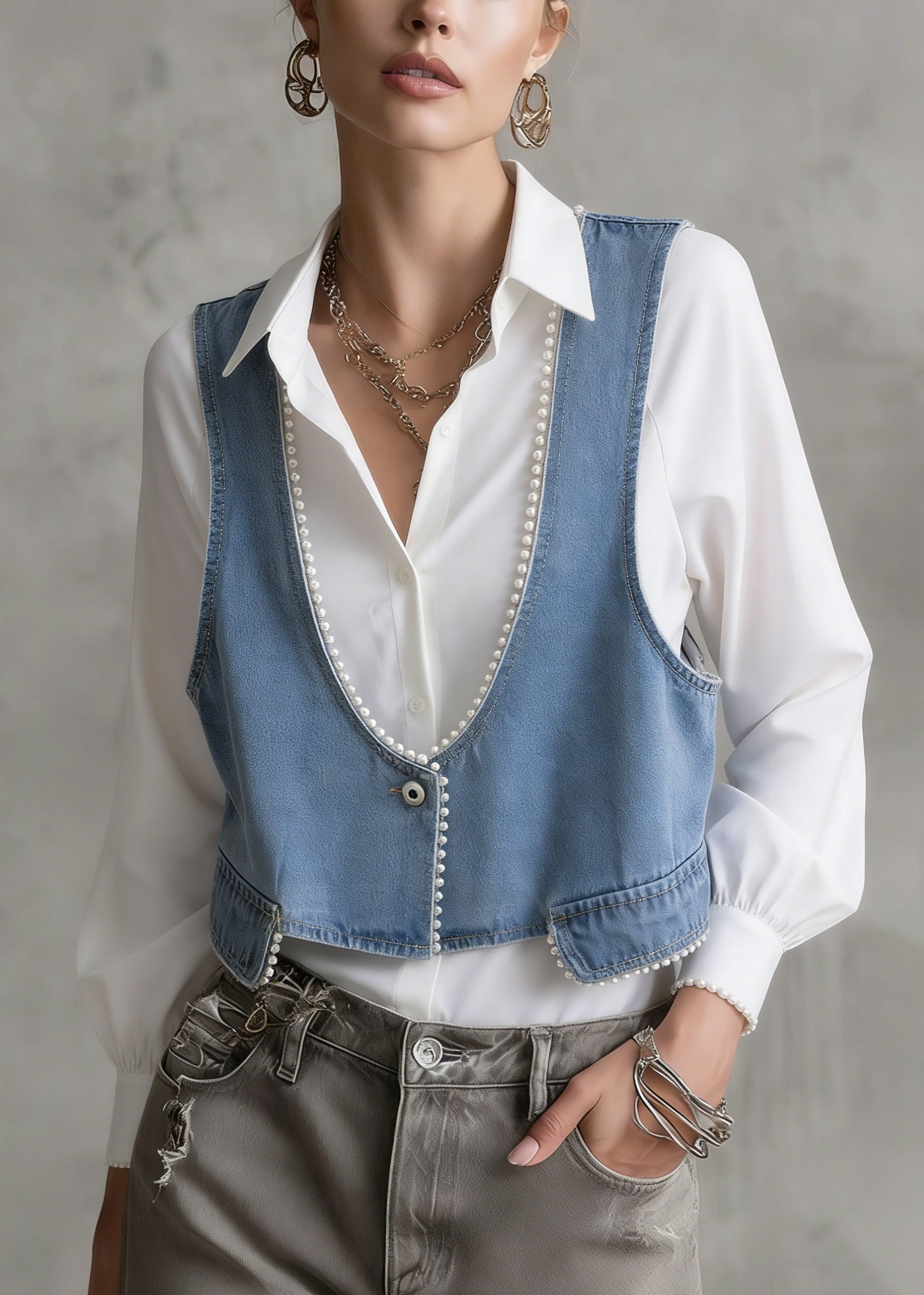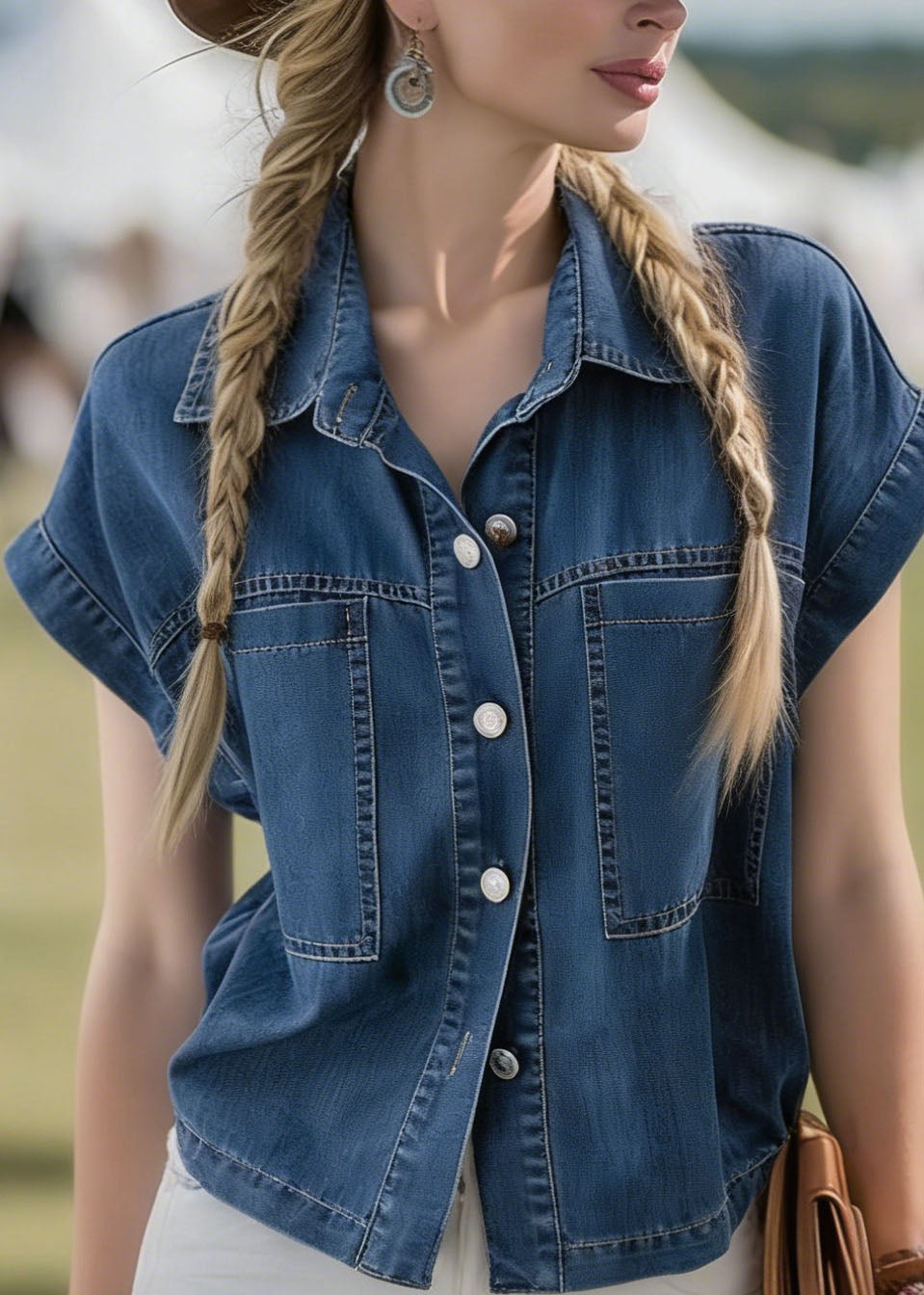 Boutique Blue Grey Chinese Button Denim Shirt Top Butterfly Sleeve