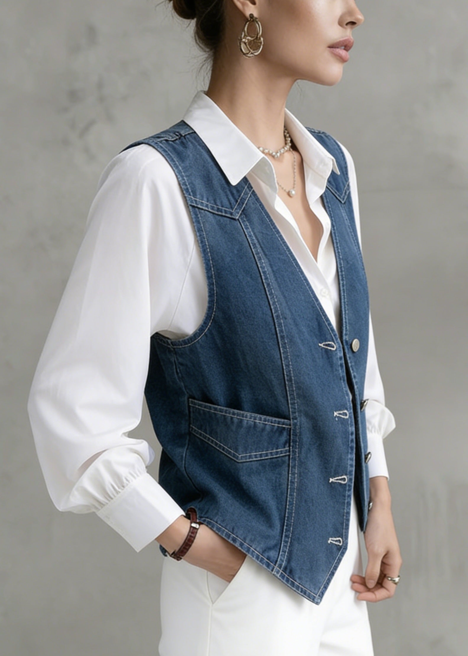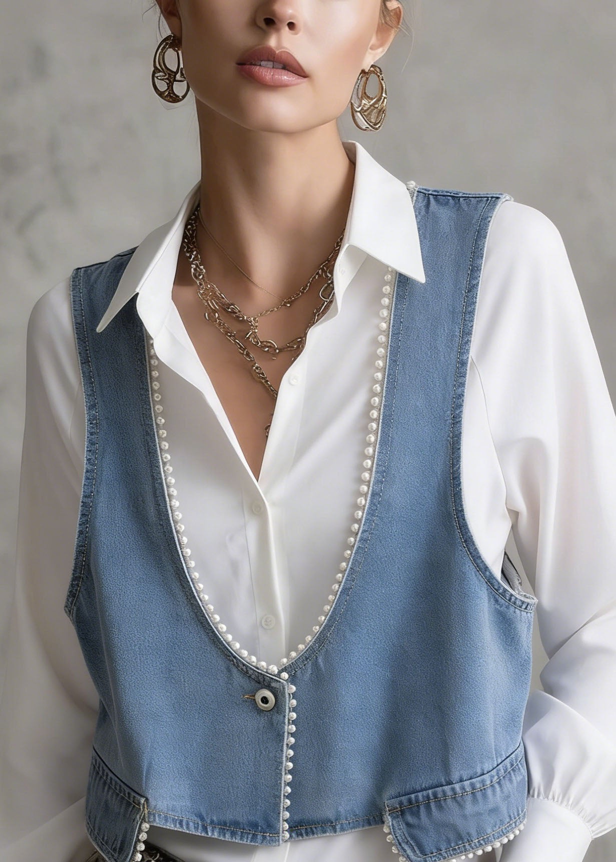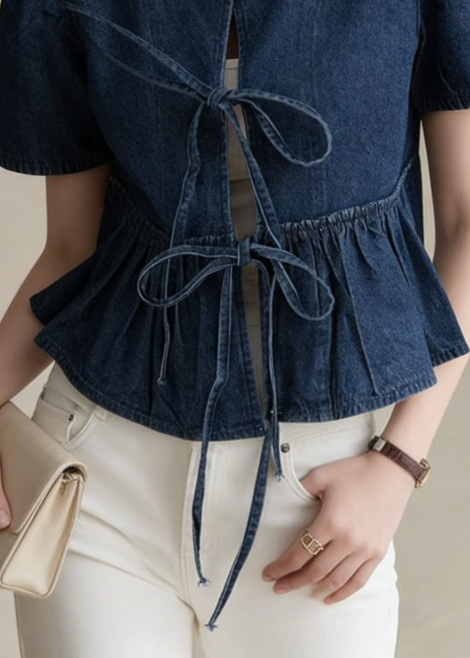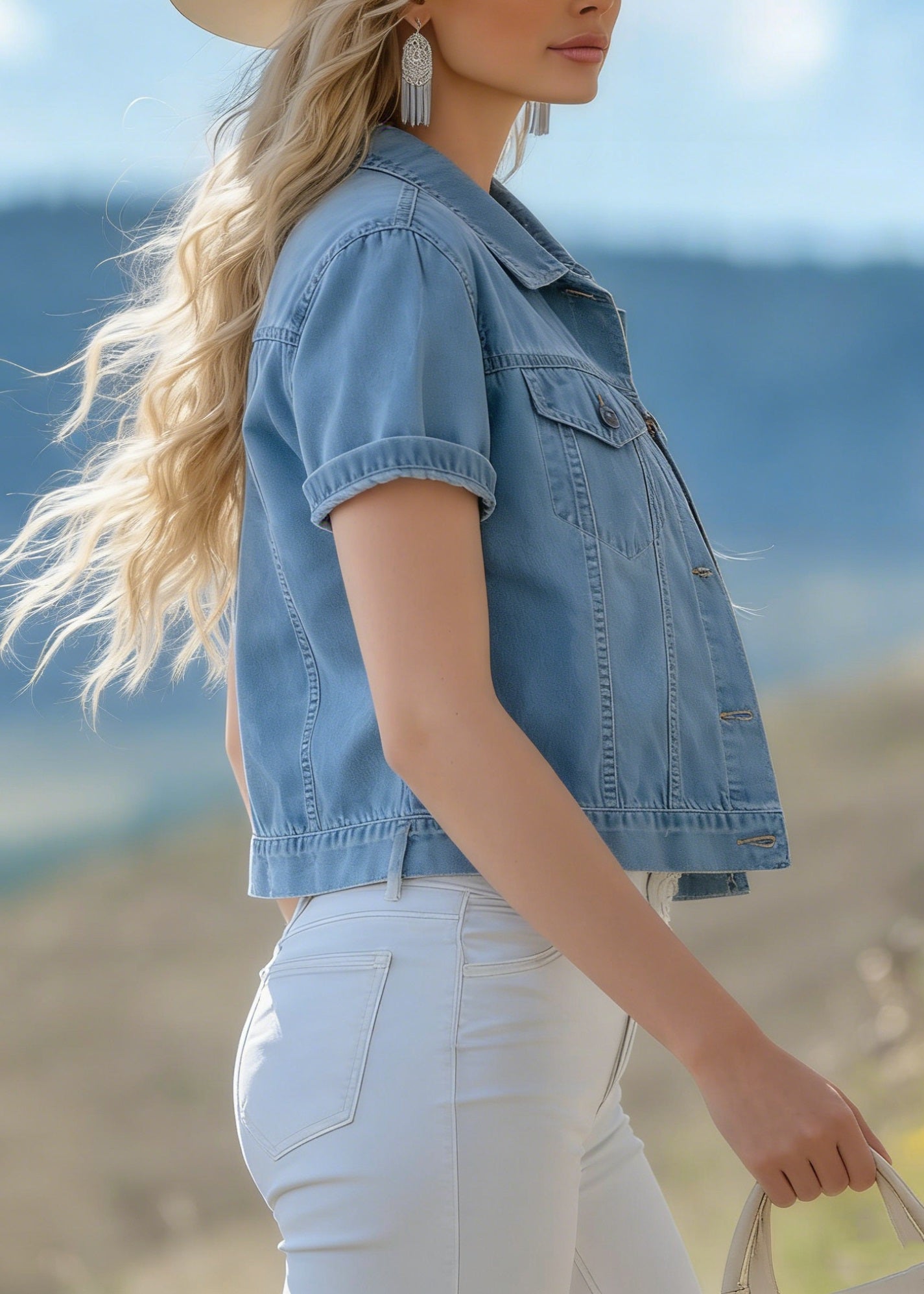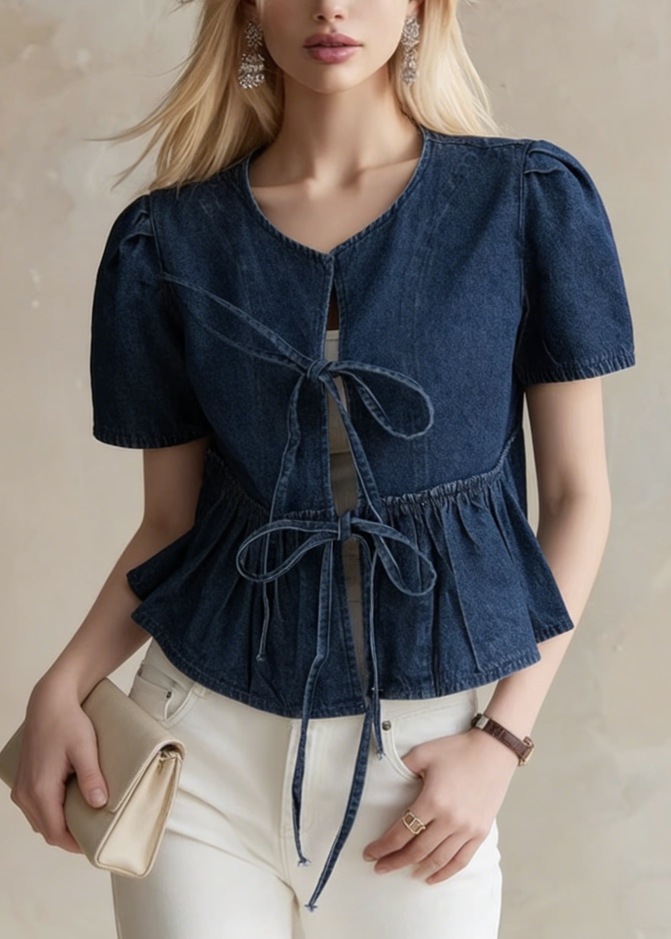 Boutique Blue Grey Chinese Button Denim Shirt Top Butterfly Sleeve