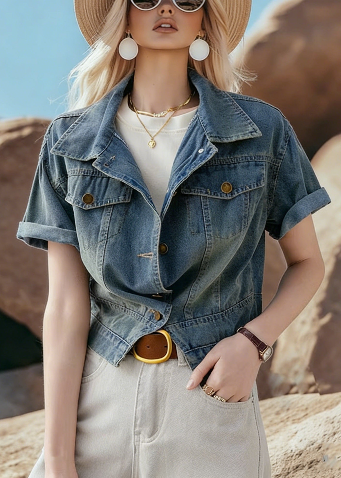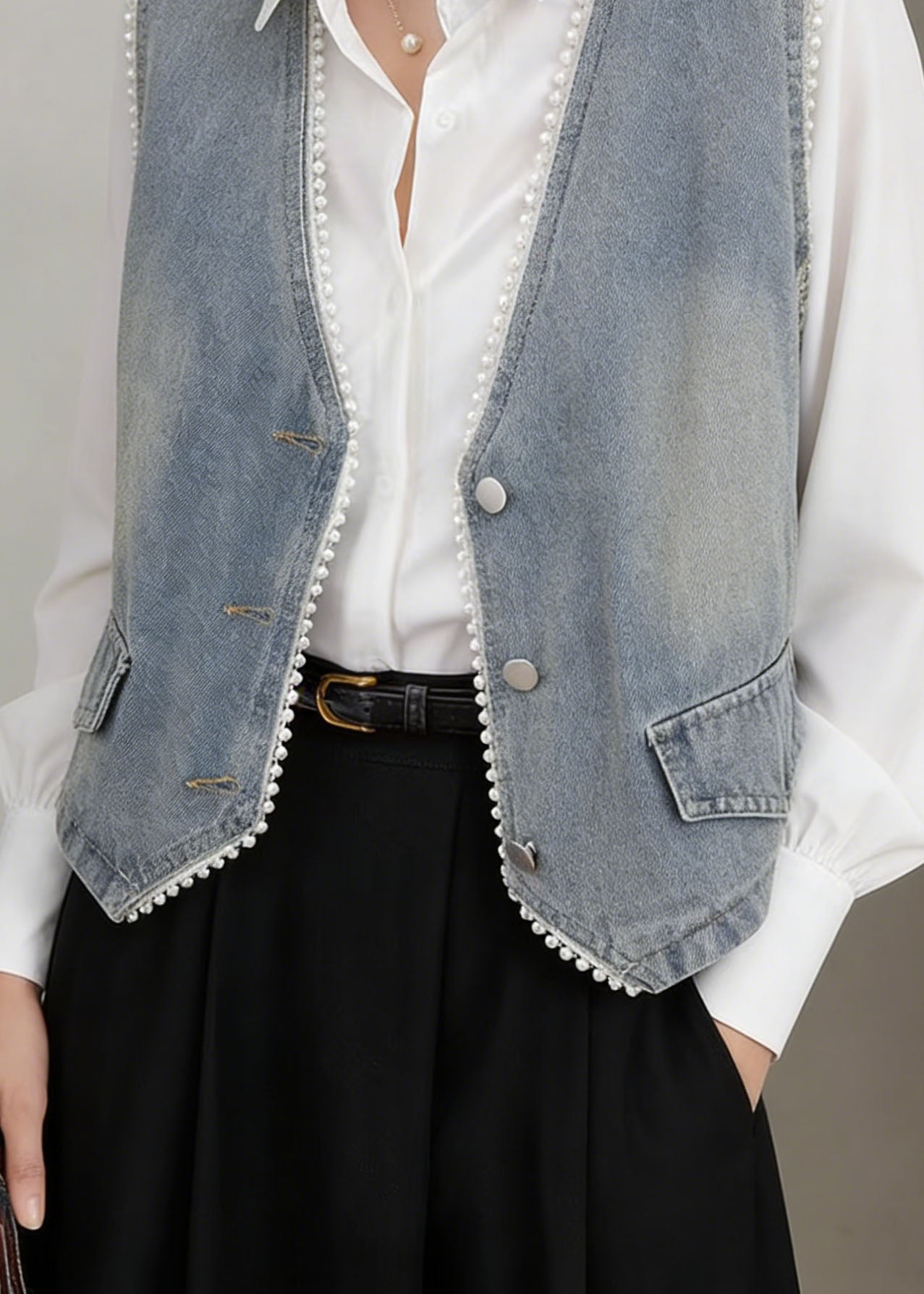 French Blue Button Pockets Front Open Denim Skirt Summer