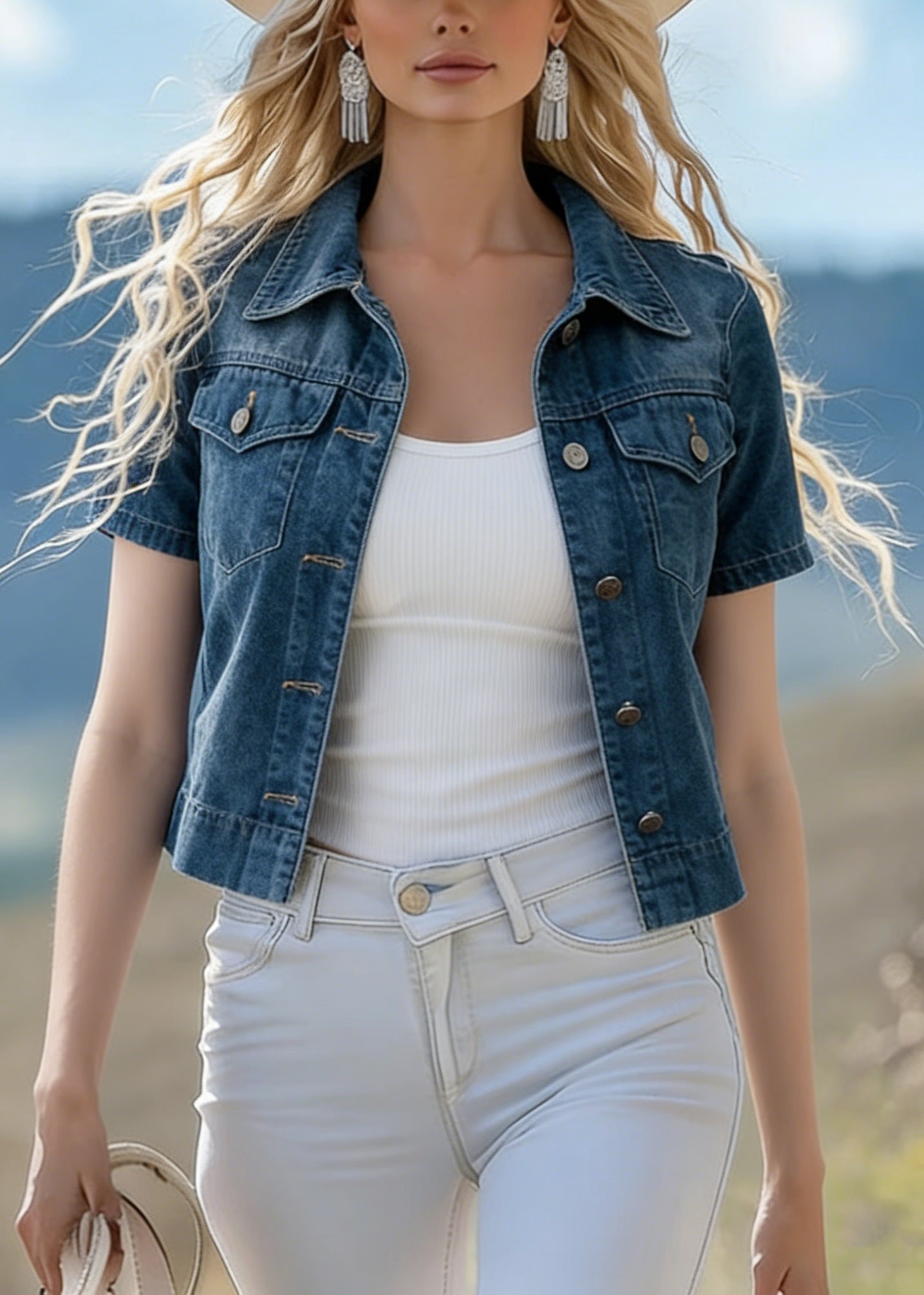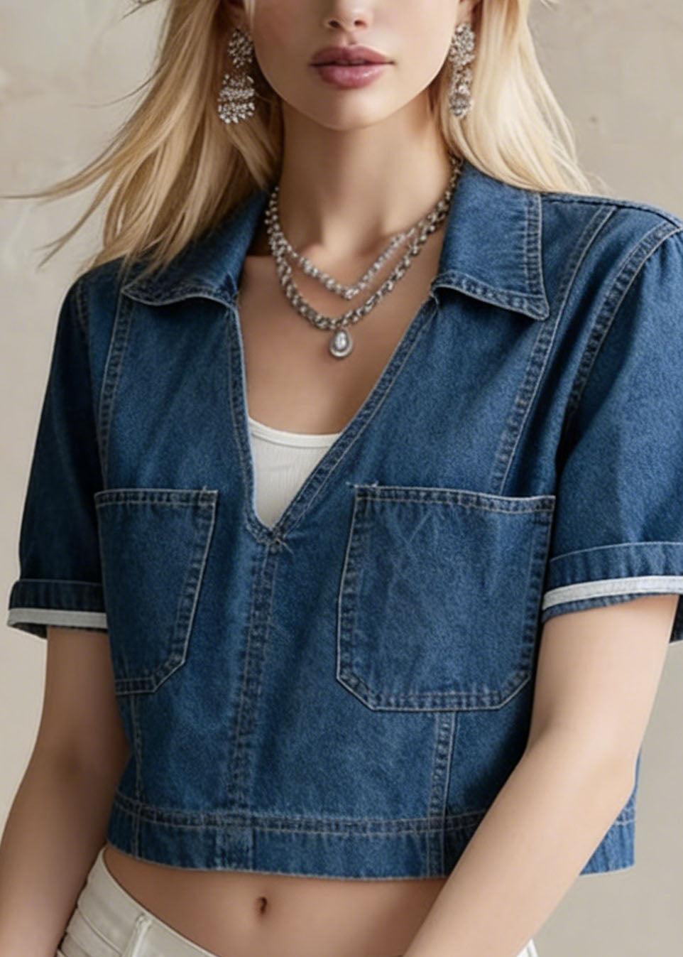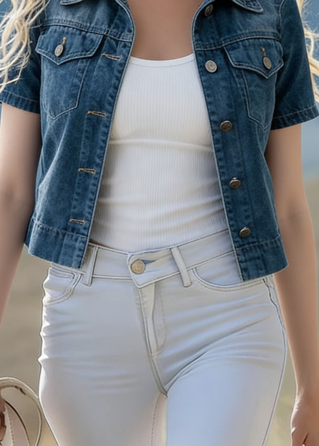 French Navy Embroidered Denim Two Pieces Set Sleeveless