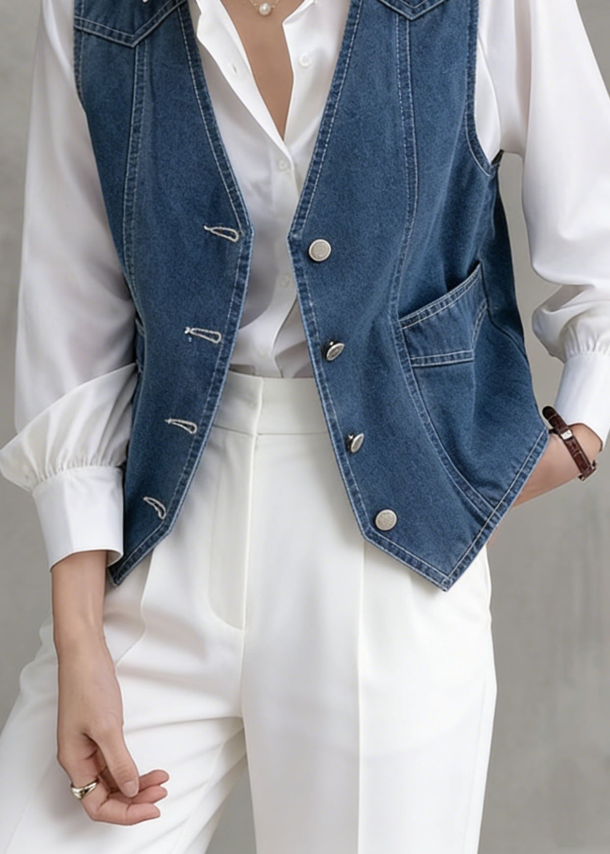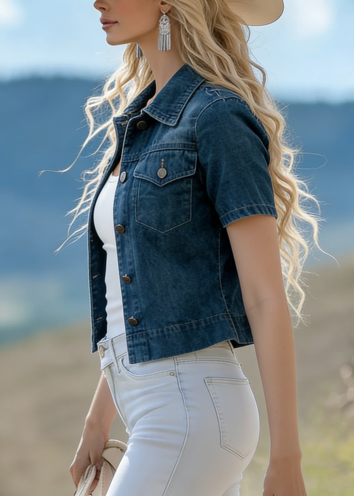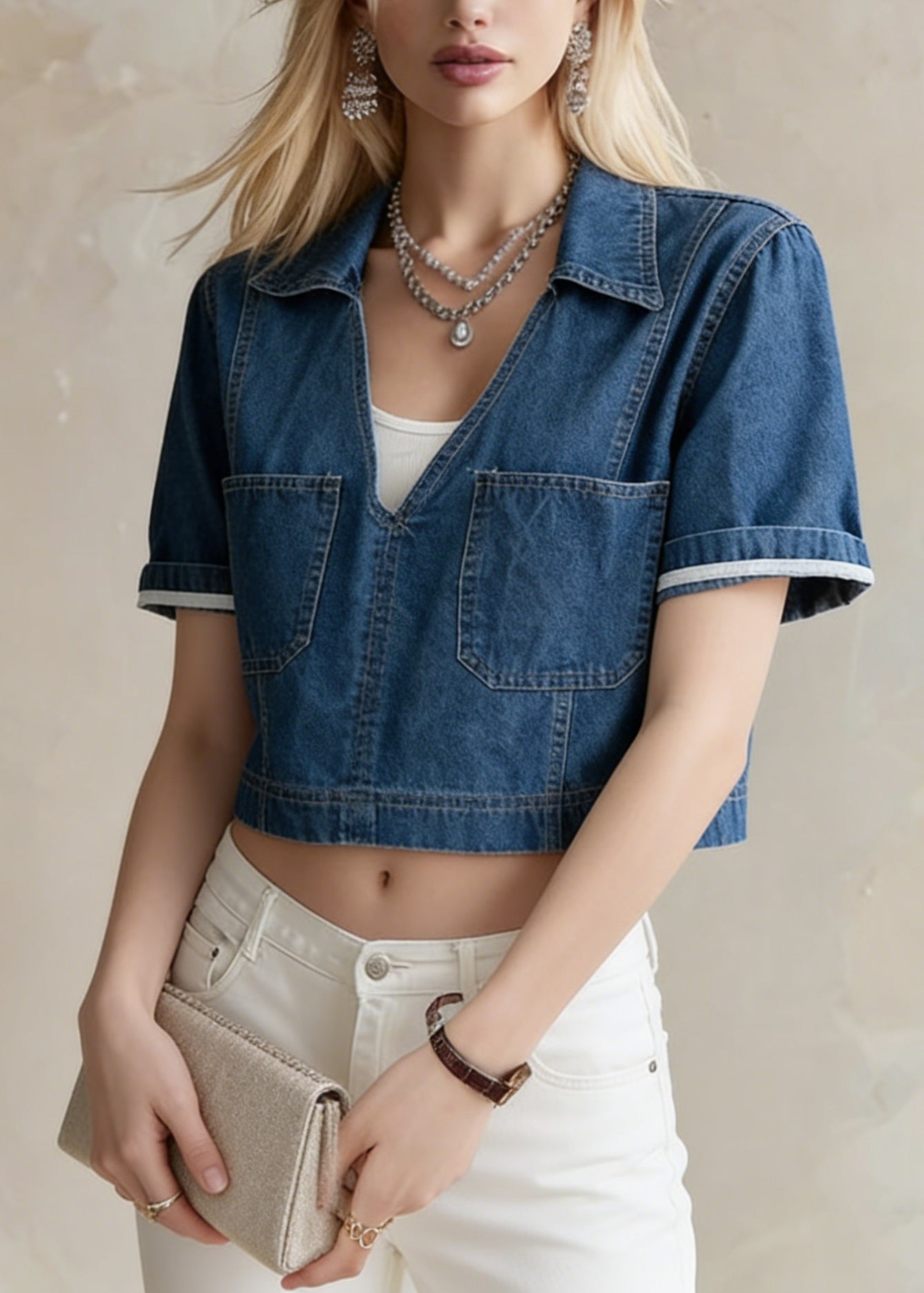 French Navy Embroidered Denim Two Pieces Set Sleeveless