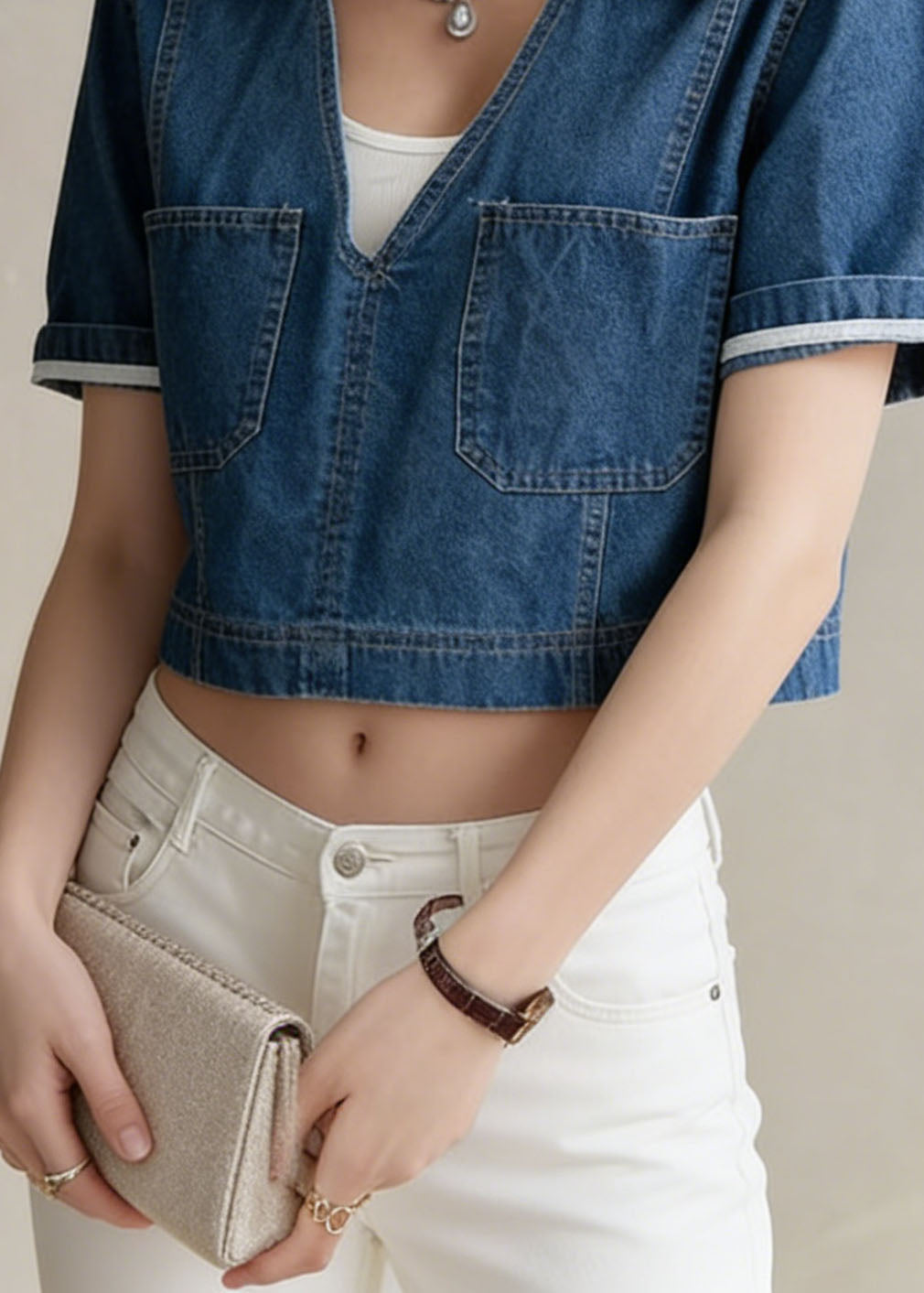 Chic Colorblock Asymmetrical Pockets High Waist Denim Crop Pants Summer