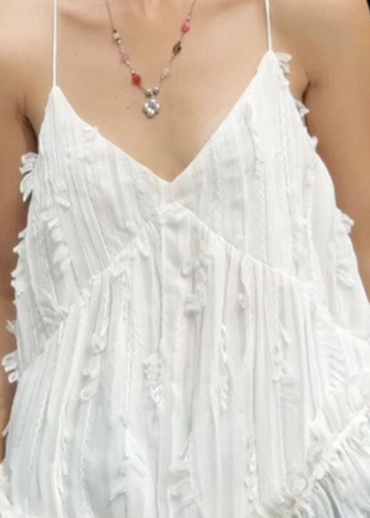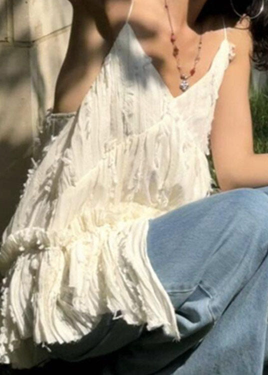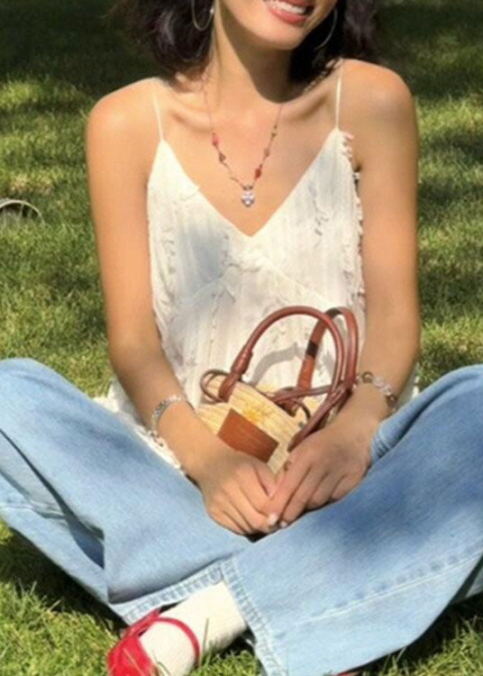 Chic White V Neck Patchwork Cotton Spaghetti Strap Tops Summer