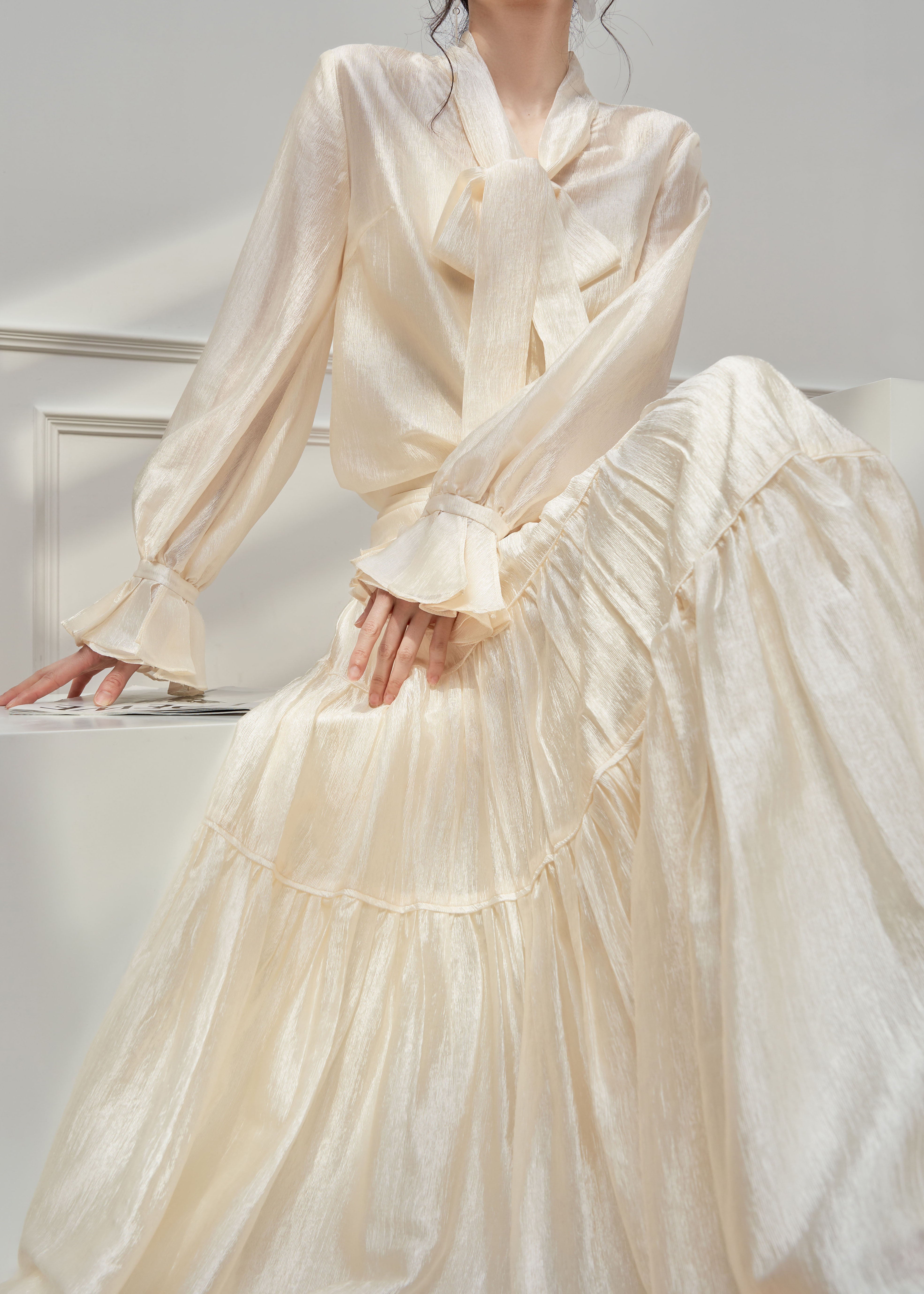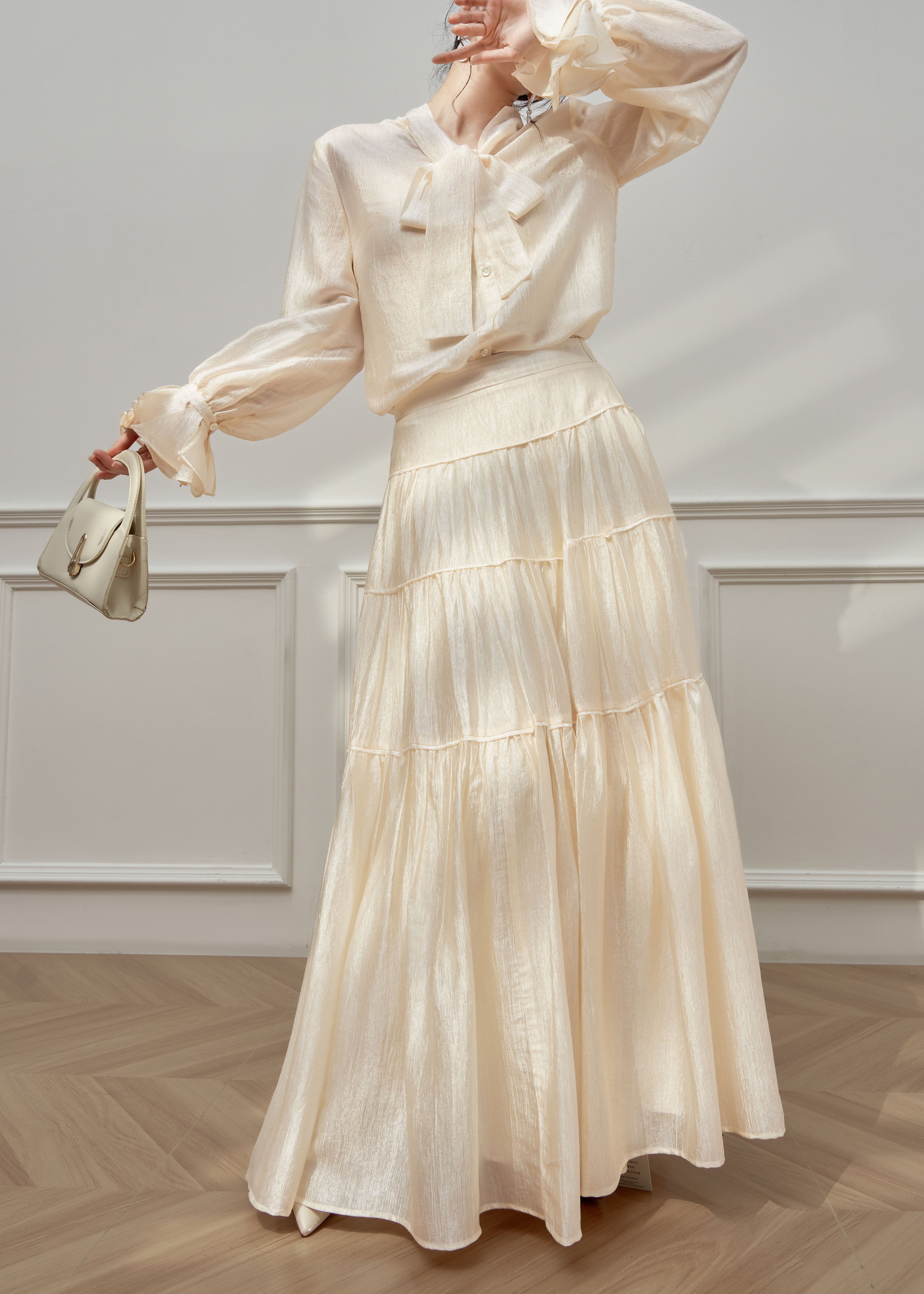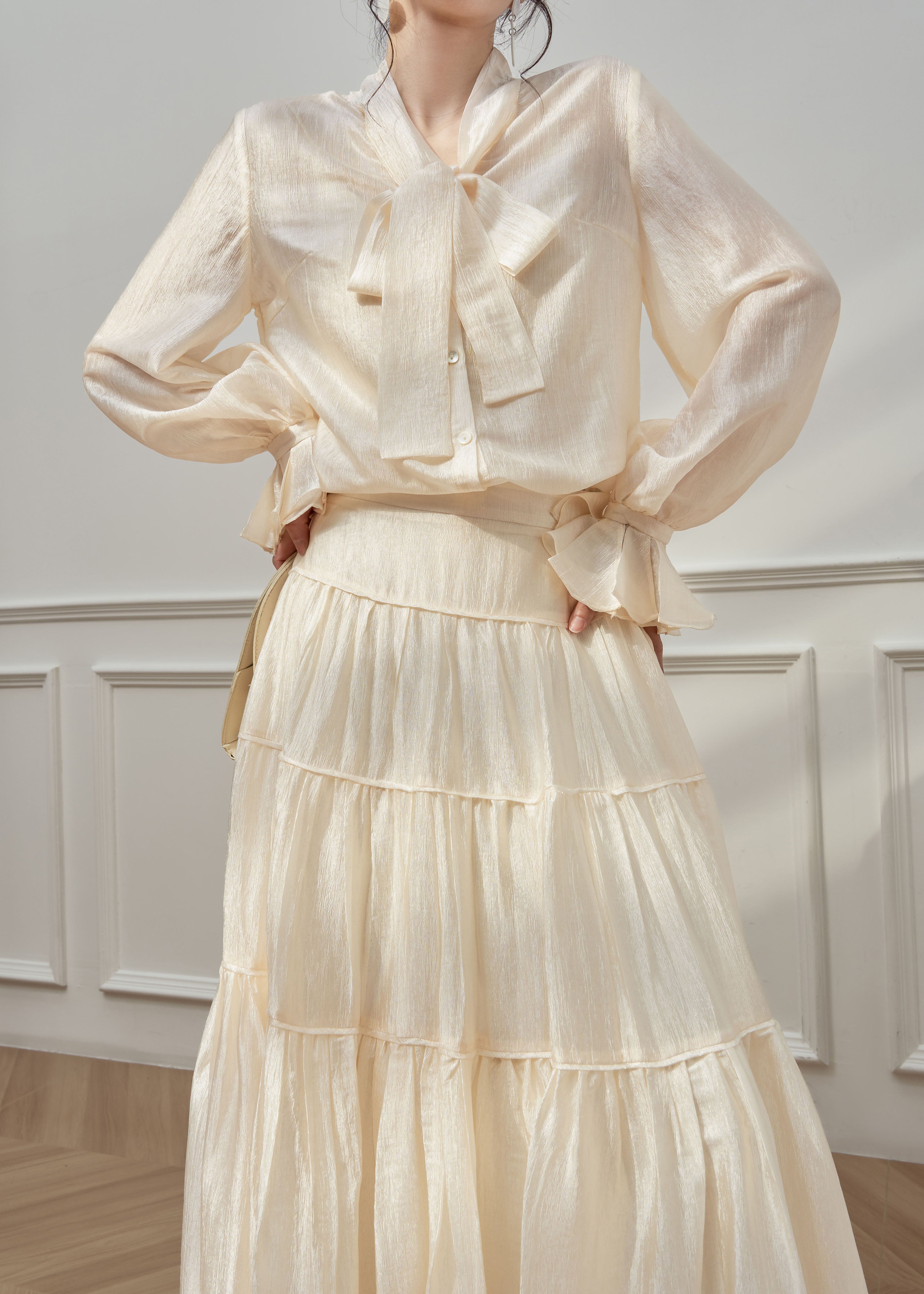 Fashion Apricot Petal Sleeve Shirts And Skirts Silk Two Pieces Set Spring