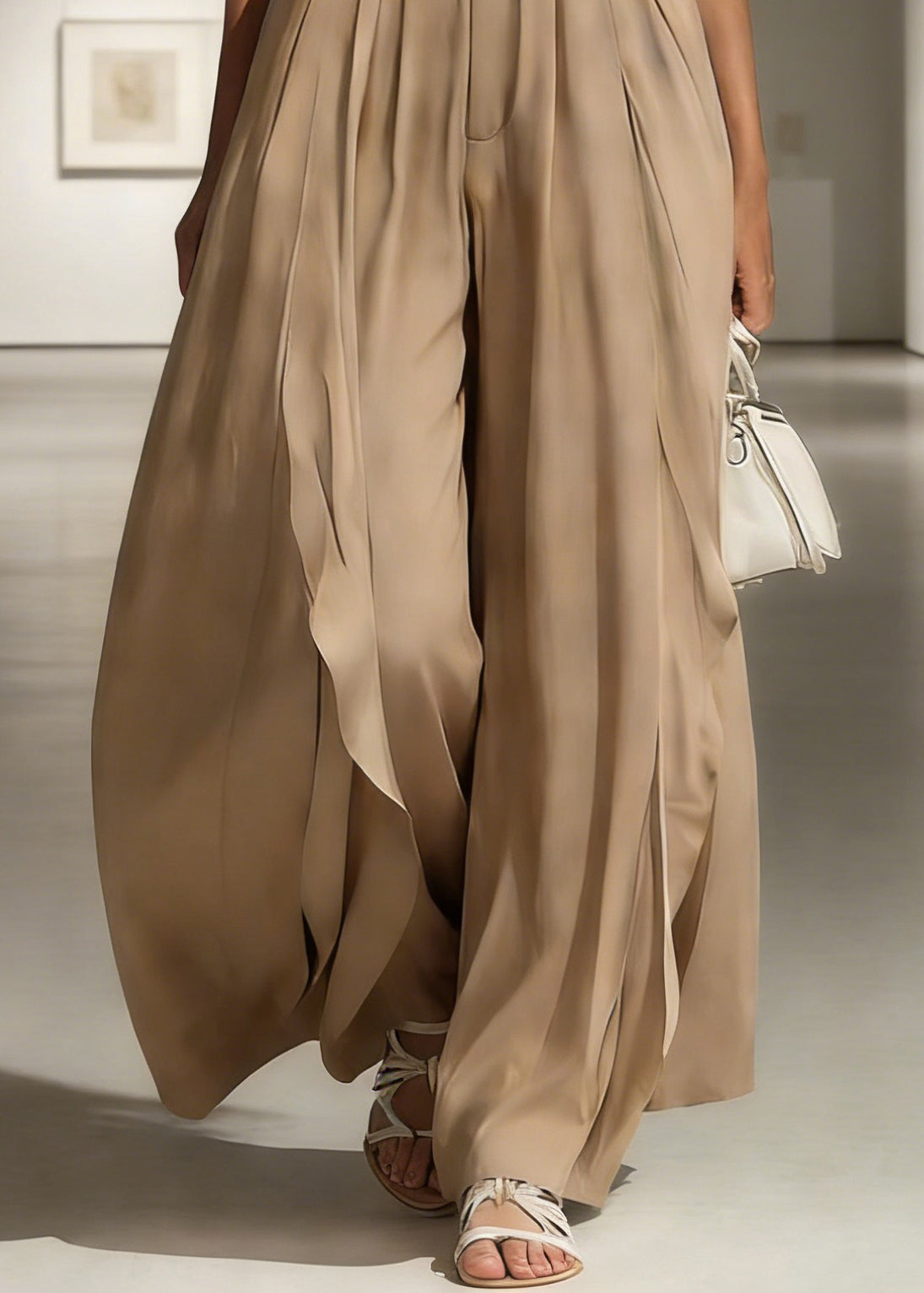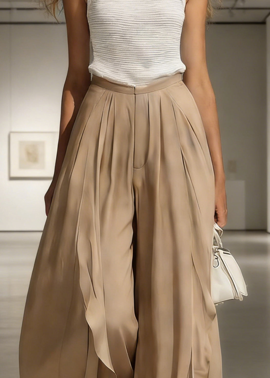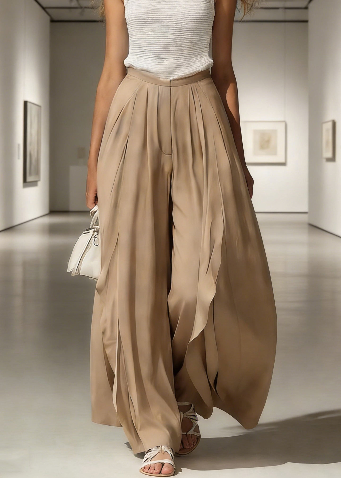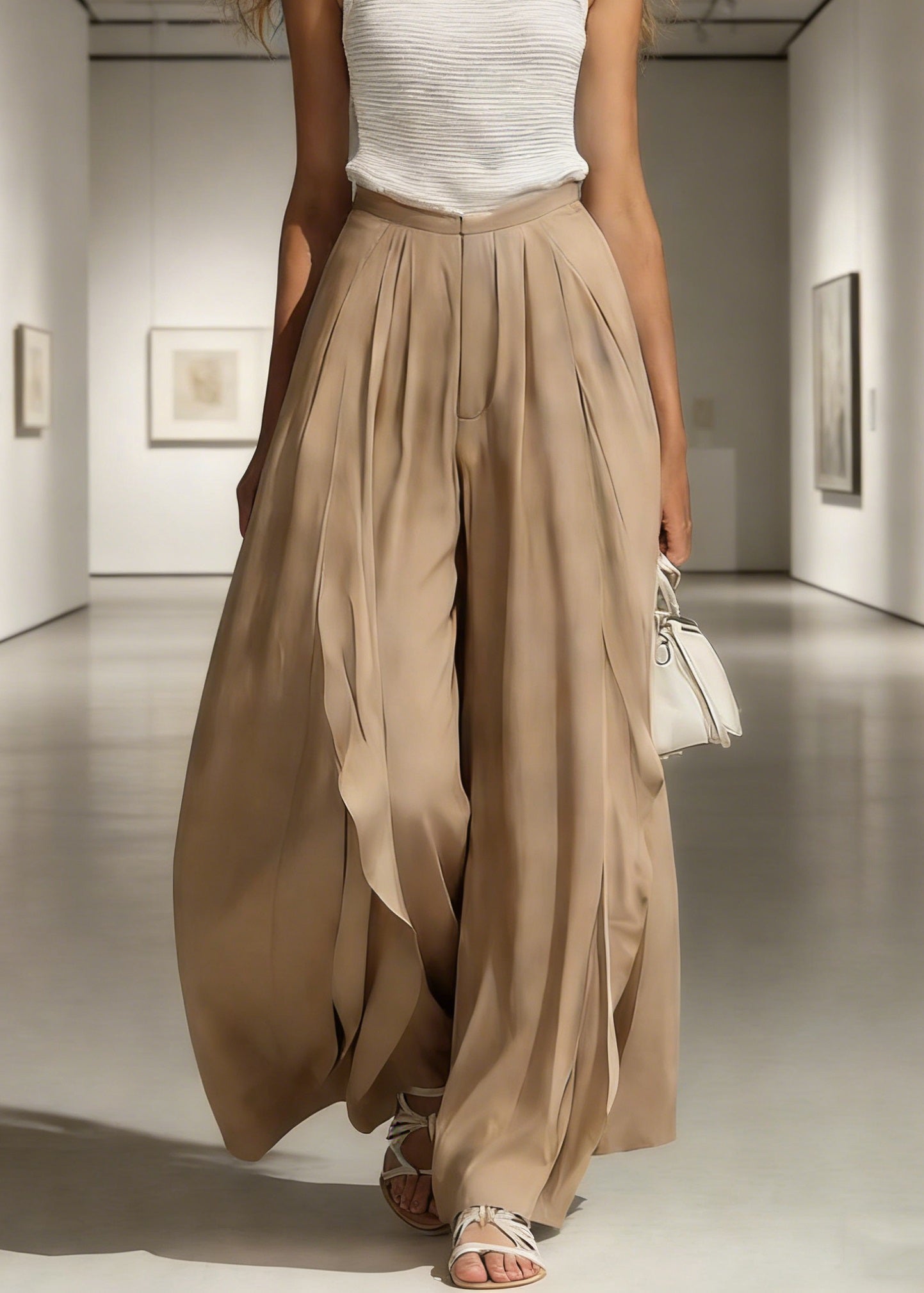 French Grey Elastic Waist Pockets Linen Wide Leg Pants Summer
