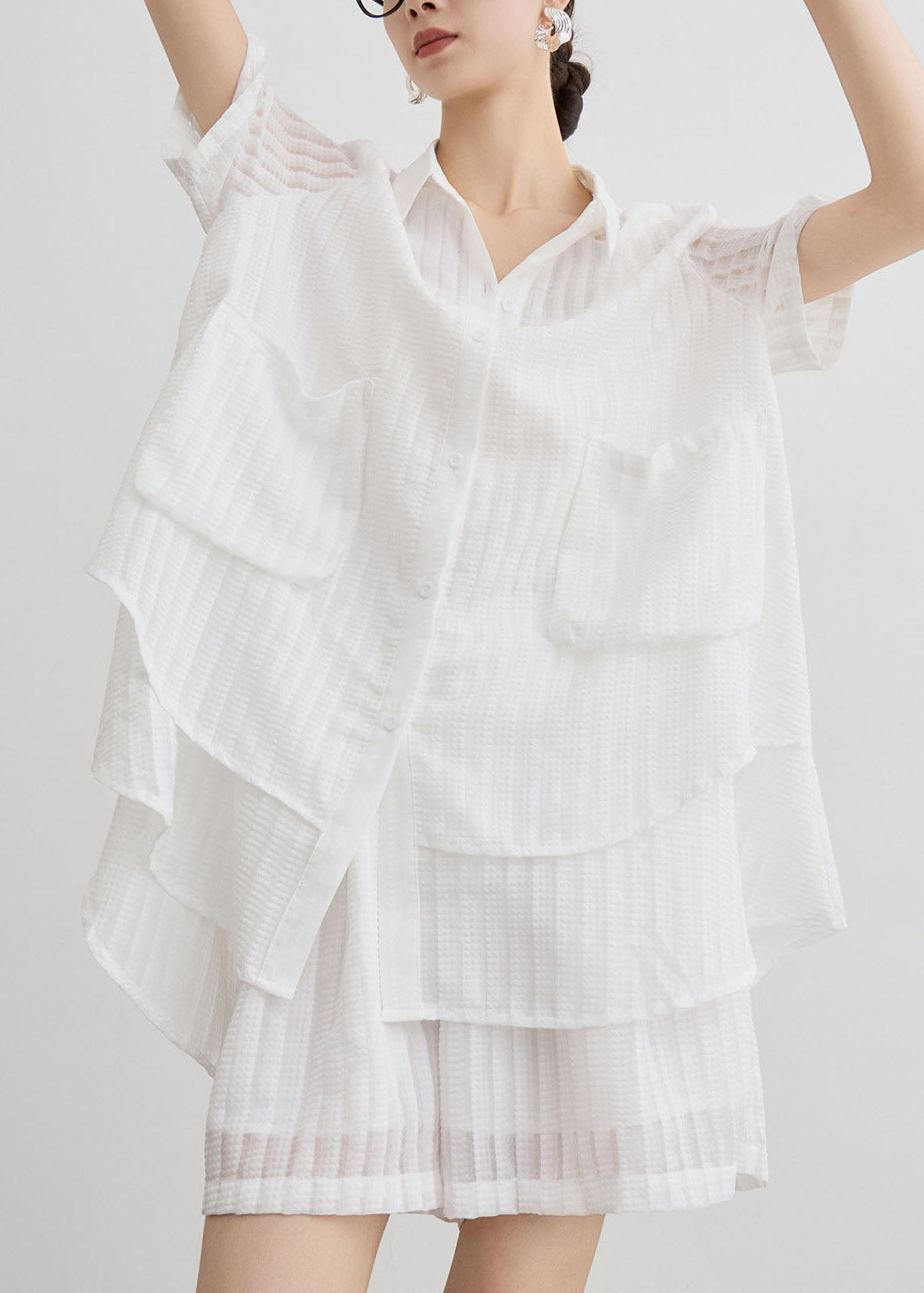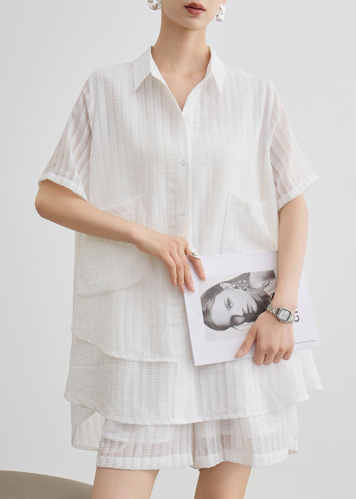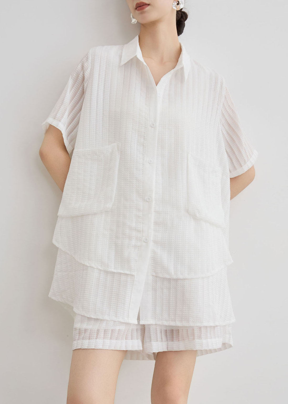 New White Peter Pan Collar Striped Cotton Two Piece Suit Set Summer