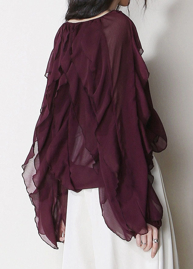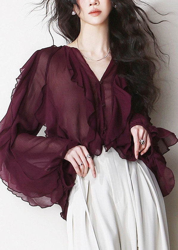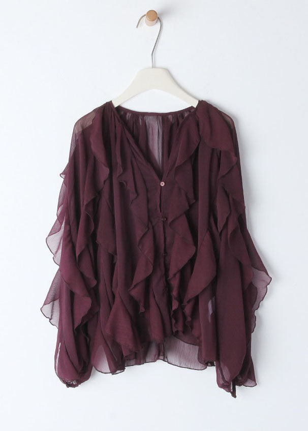 Women Mulberry V Neck Ruffled Patchwork Chiffon Blouses Summer