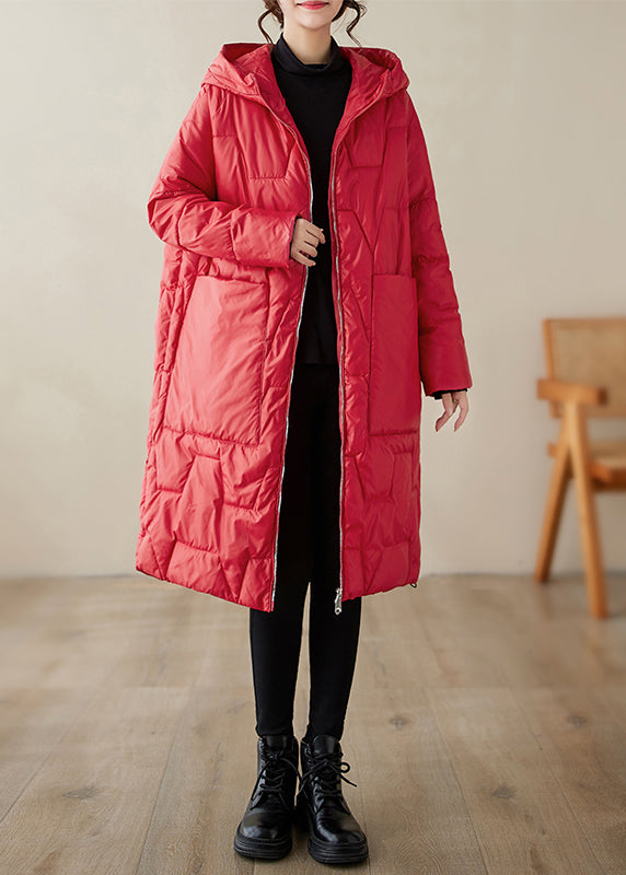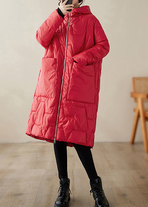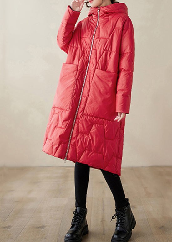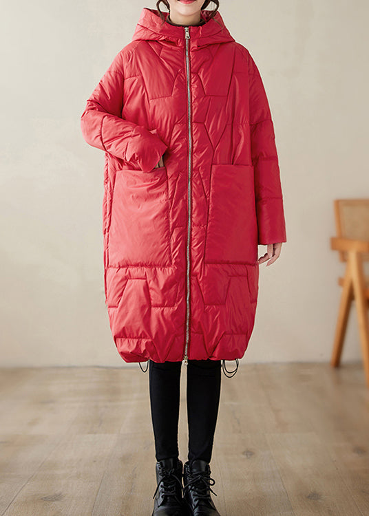 Plus Size Red Hooded Pockets Fine Cotton Filled Coat Winter