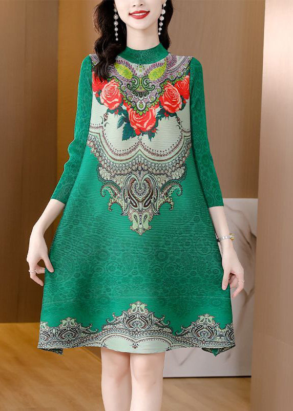 Women Purple Stand Collar Print Wrinkled Holiday Dress Bracelet Sleeve