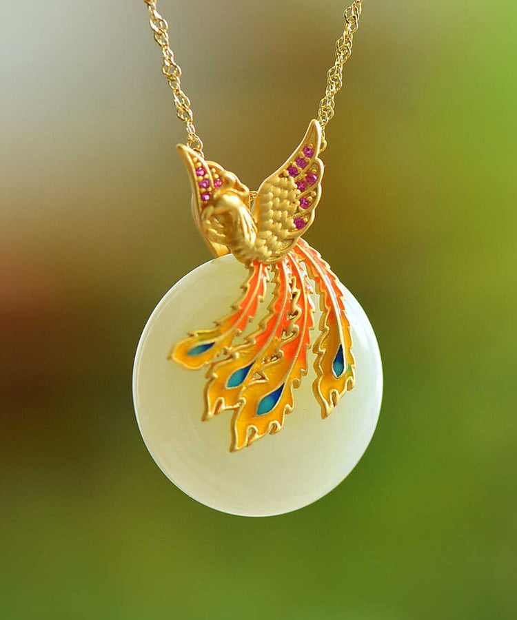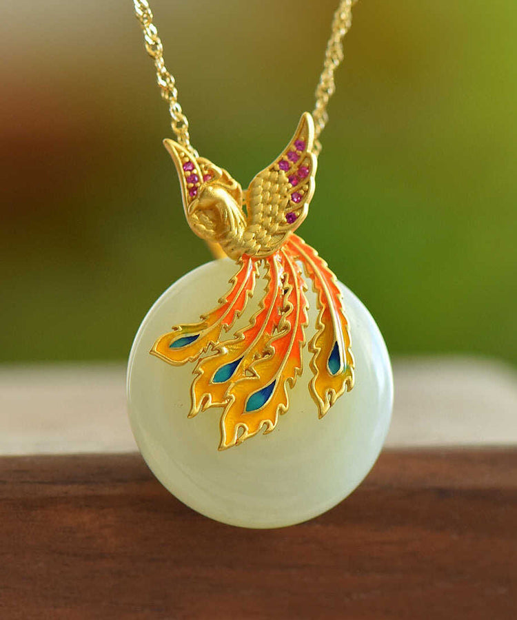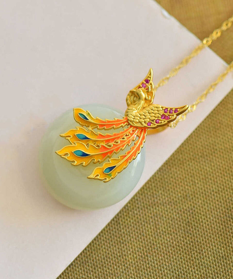Original Design Gold Sterling Silver Overgild Inlaid Jade Phoenix Pendant Necklace