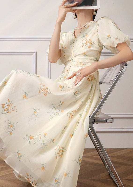 Elegant Apricot Print High Waist Chiffon Dress Summer