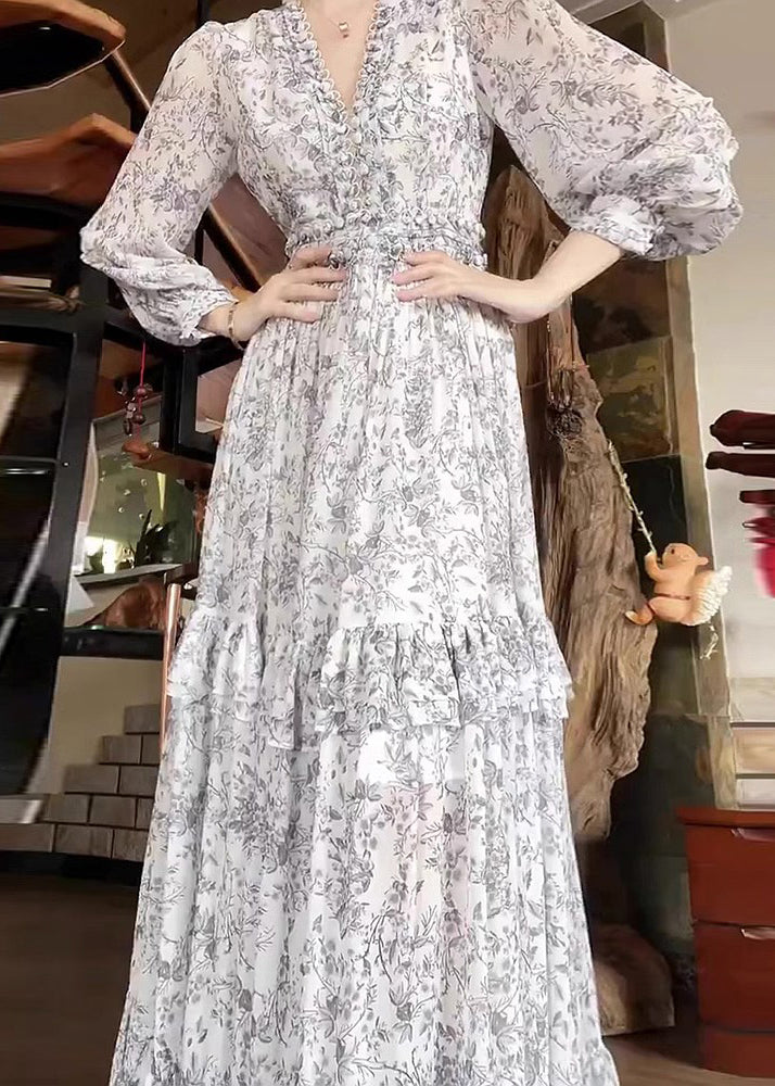Elegant White Ruffled Print Chiffon Dress Long Sleeve