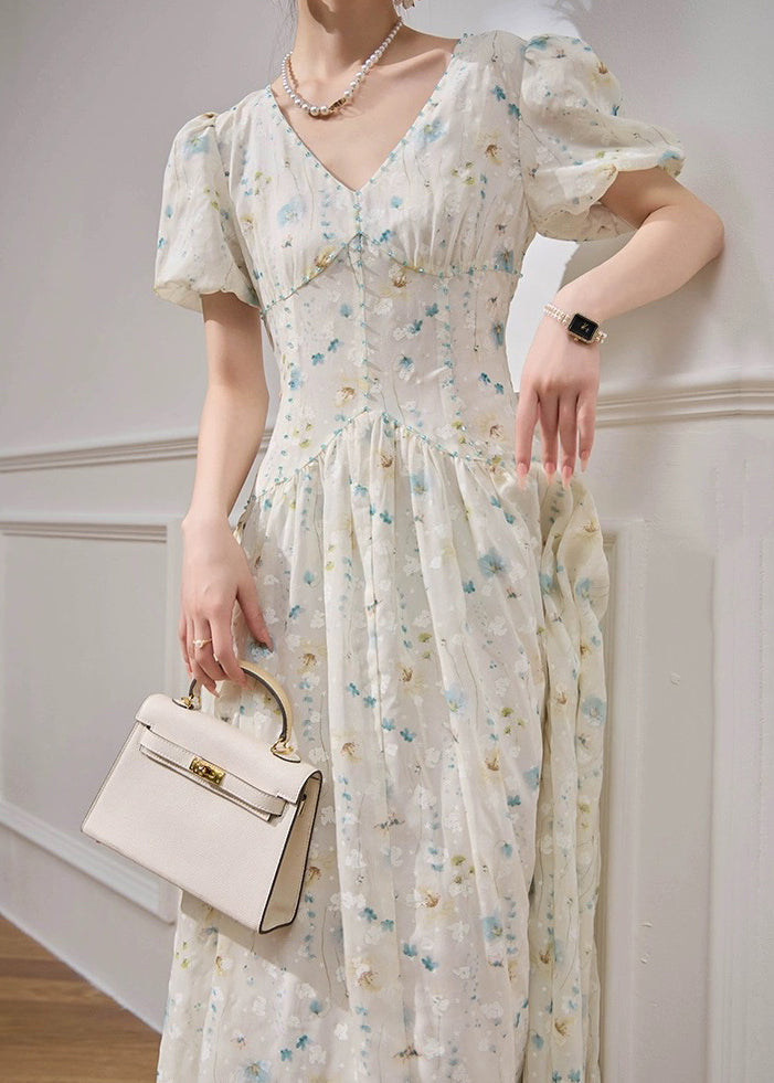 Elegant V Neck Print High Waist Chiffon Dress Long Sleeve