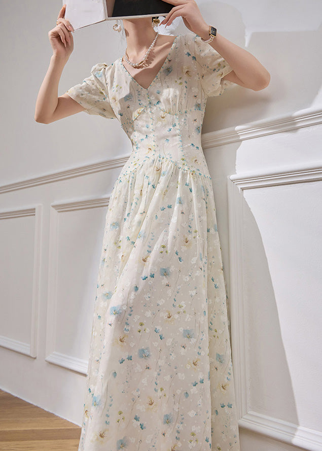 Elegant White V Neck Patchwork Chiffon Long Dress Short Sleeve