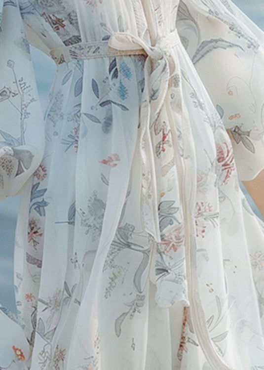 French White Print Tie Waist Long Dresses Lantern Sleeve