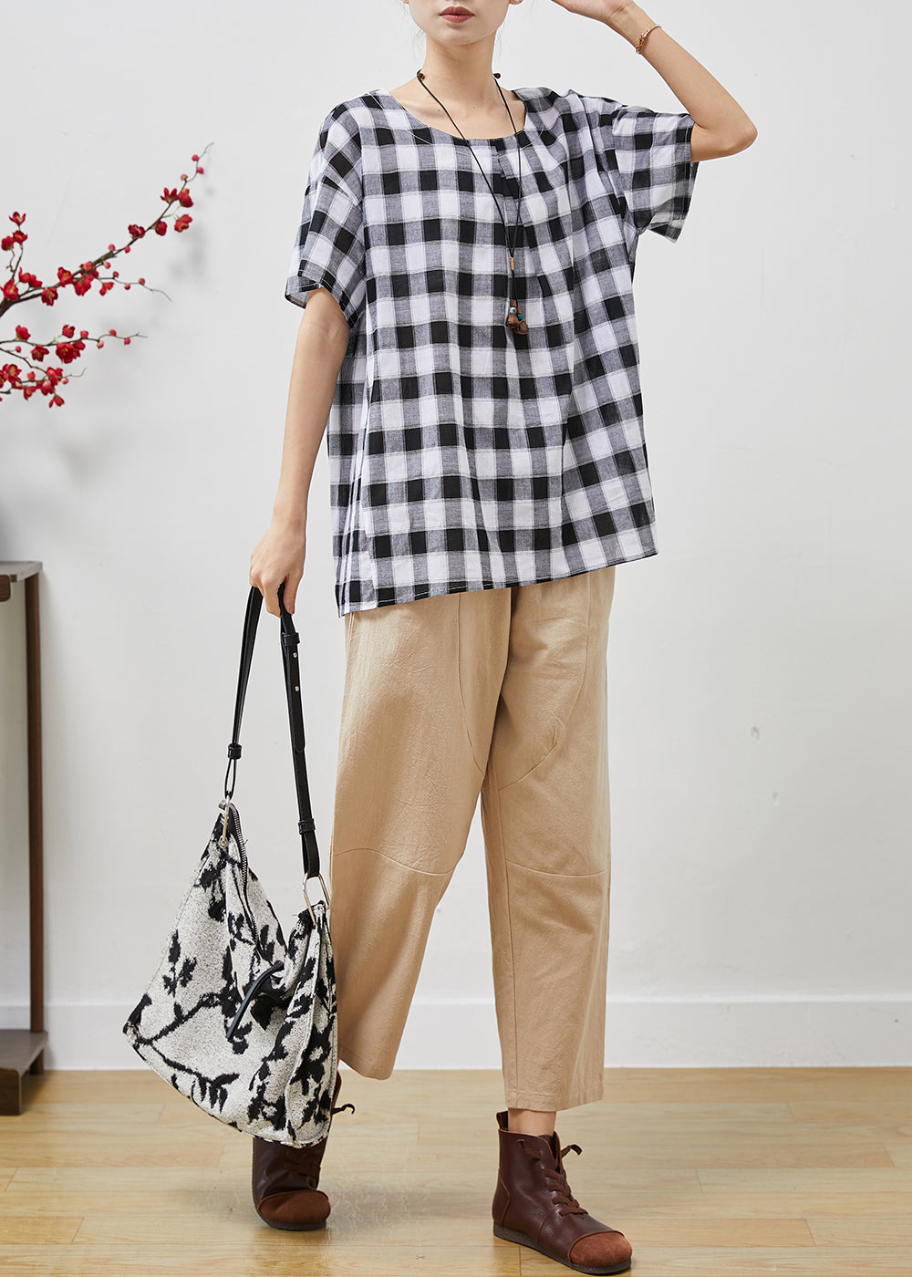 Casual Grey Oversized Plaid Linen Two Piece Set Women Clothing Summer