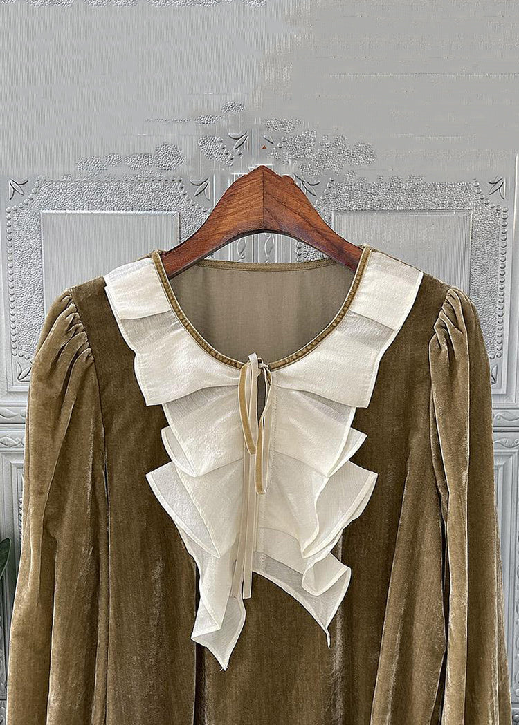 Loose Camel Ruffled Lace Up Patchwork Silk Velour Top Fall