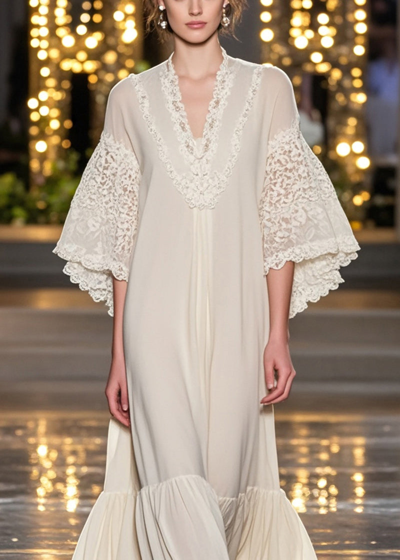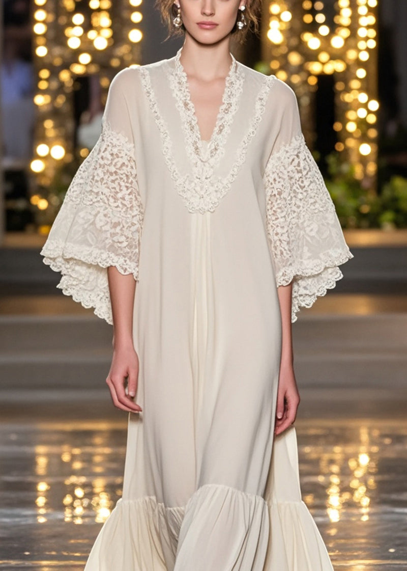 Bohemian White V Neck Patchwork Lace Ankle Dress Flare Sleeve
