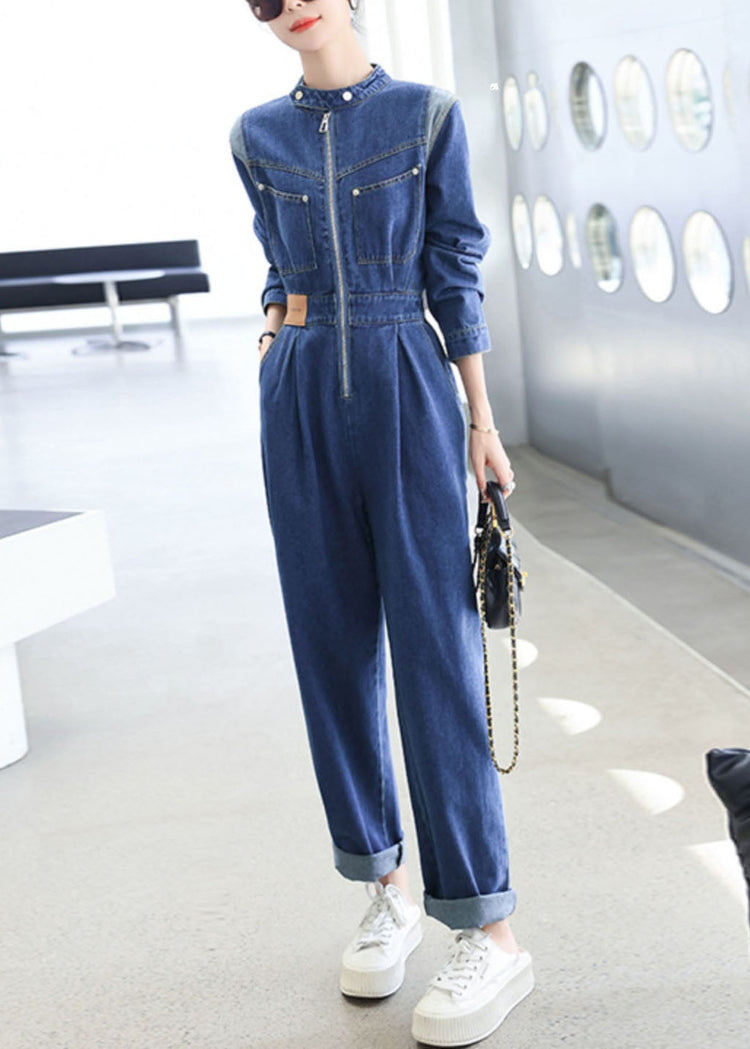 Natural Dark Blue O-Neck Patchwork Flattering Denim Jumpsuit Fall