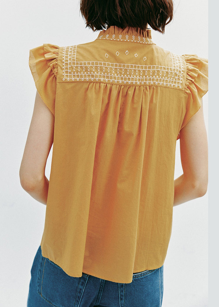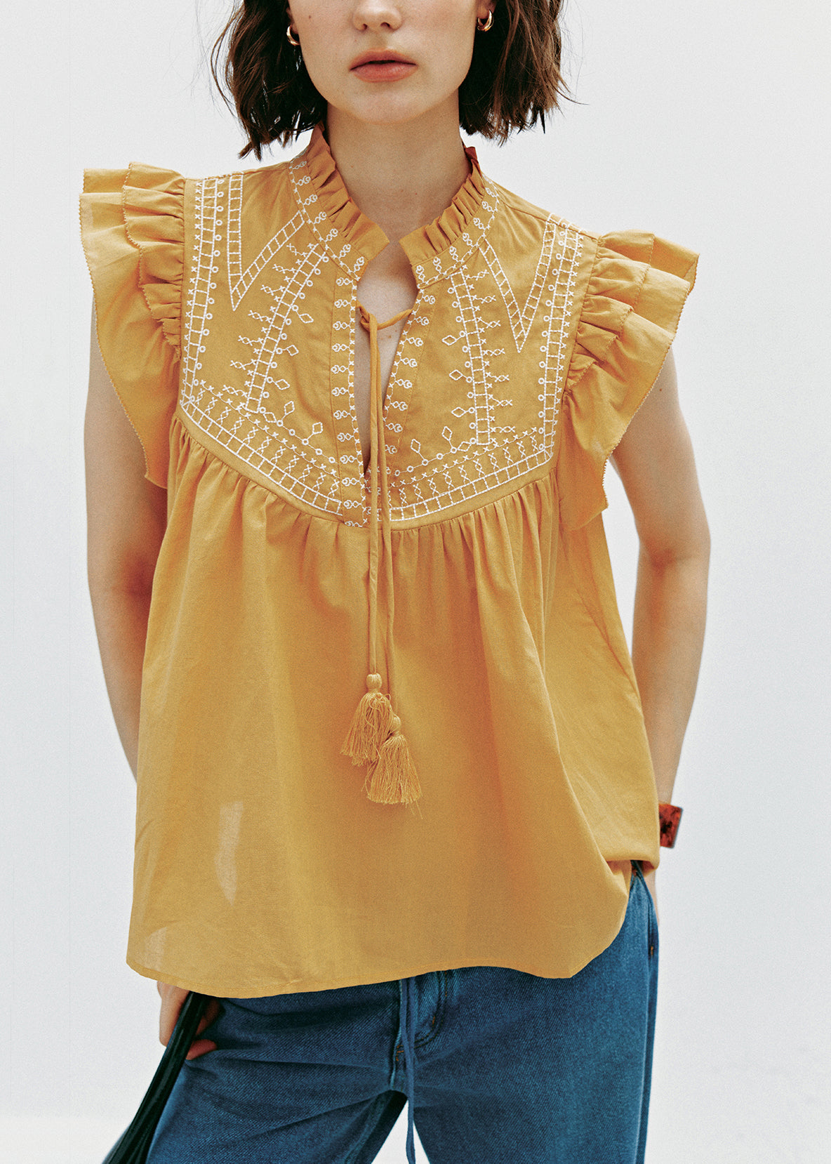 New Yellow Embroidered Tassel Cotton Top Butterfly Sleeve