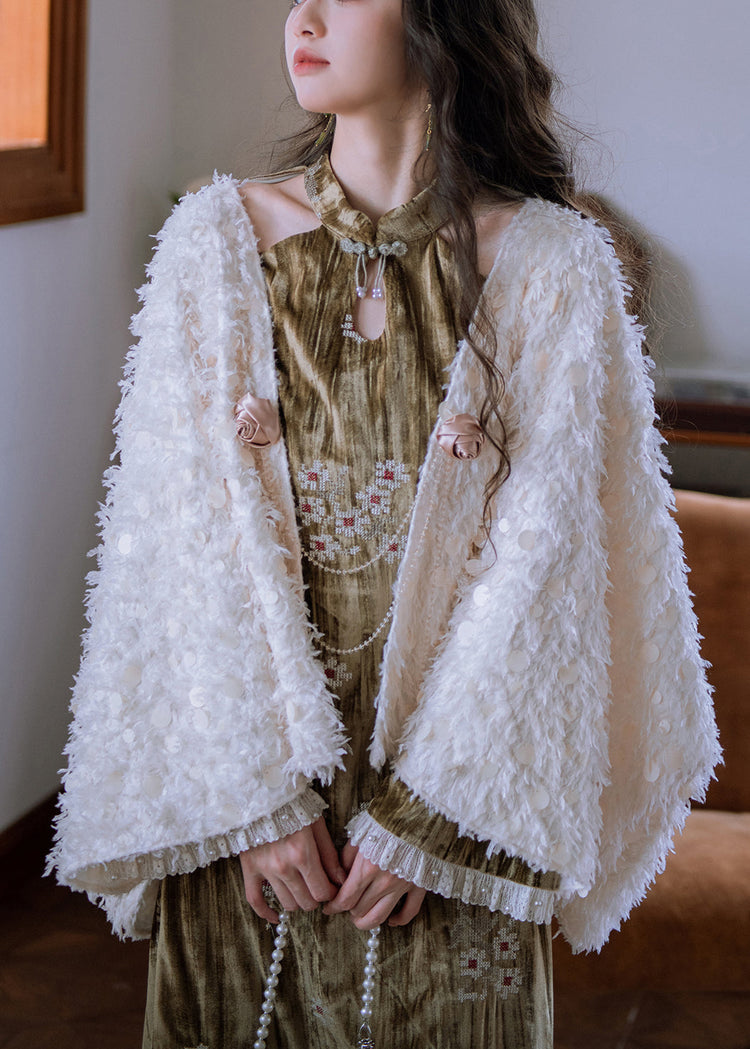 Art White Bow Sequins Teddy Faux Fur Cape Coats Batwing Sleeve