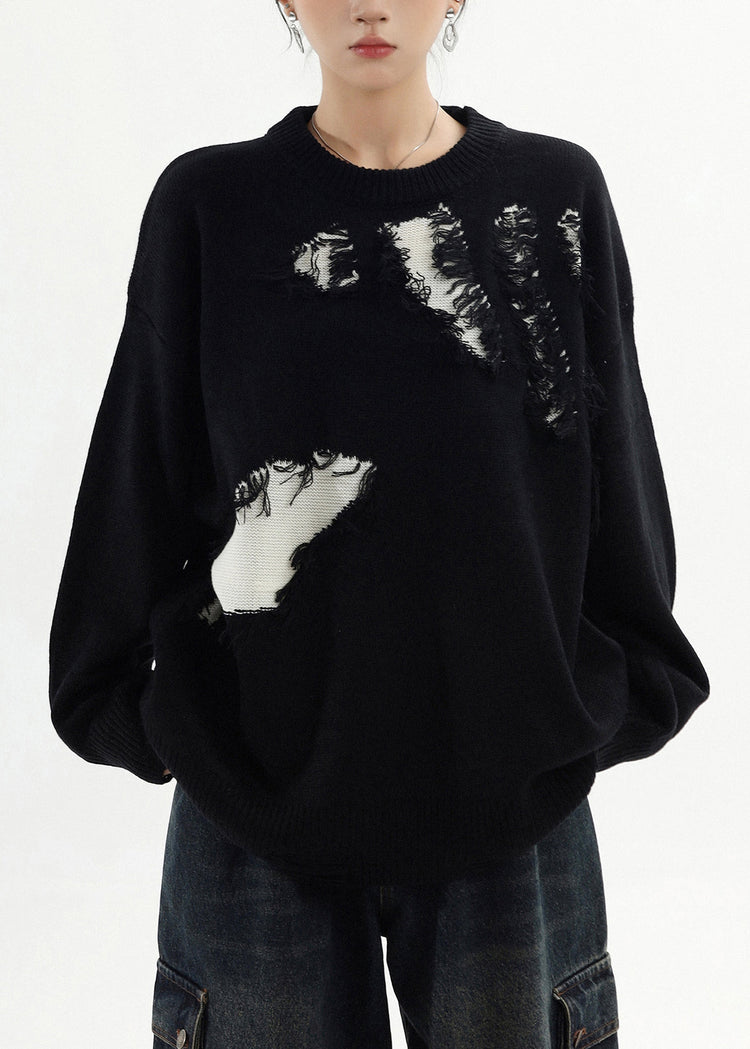 Classy Black Oversized Patchwork Ripped Sweater Tops Winter