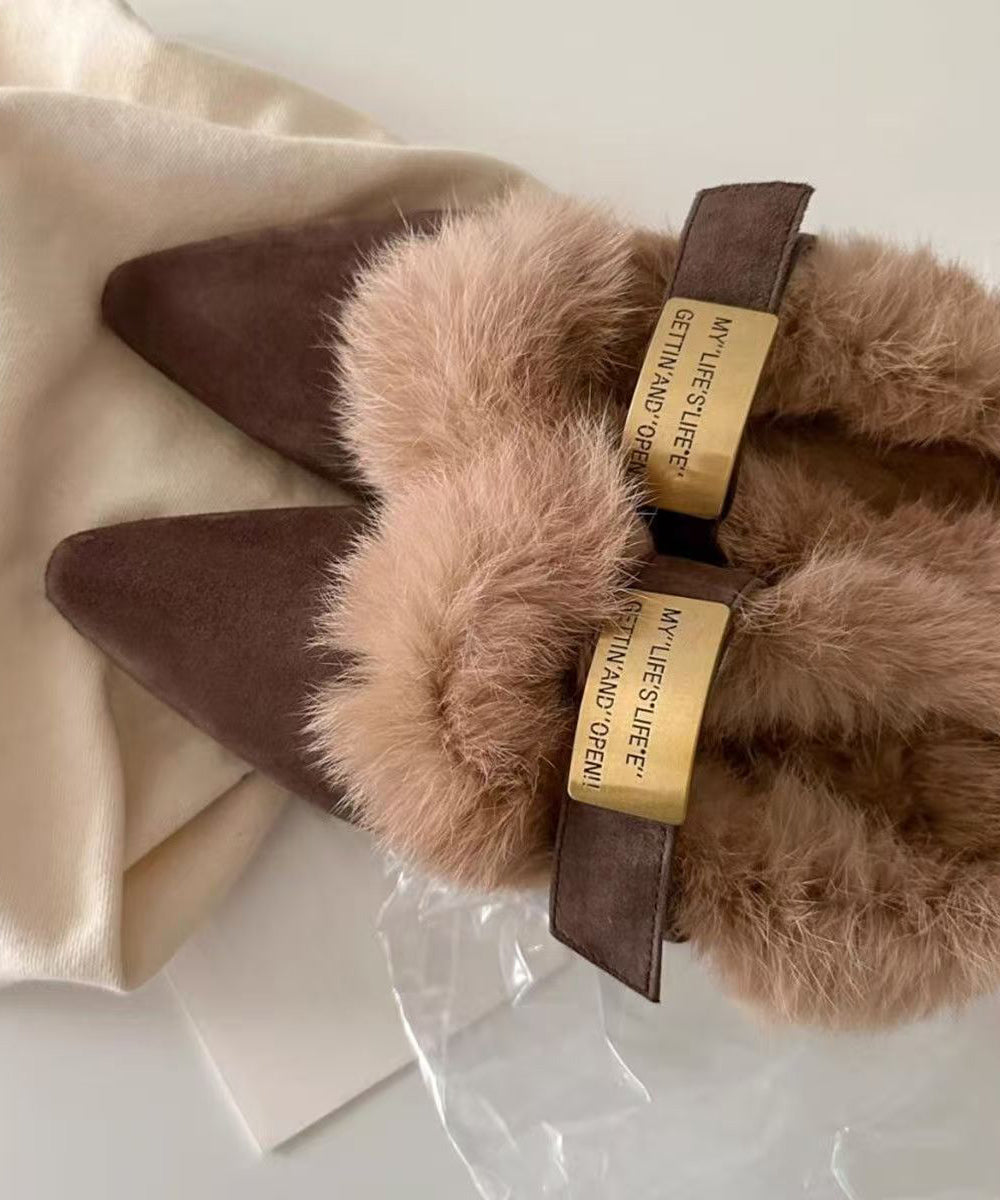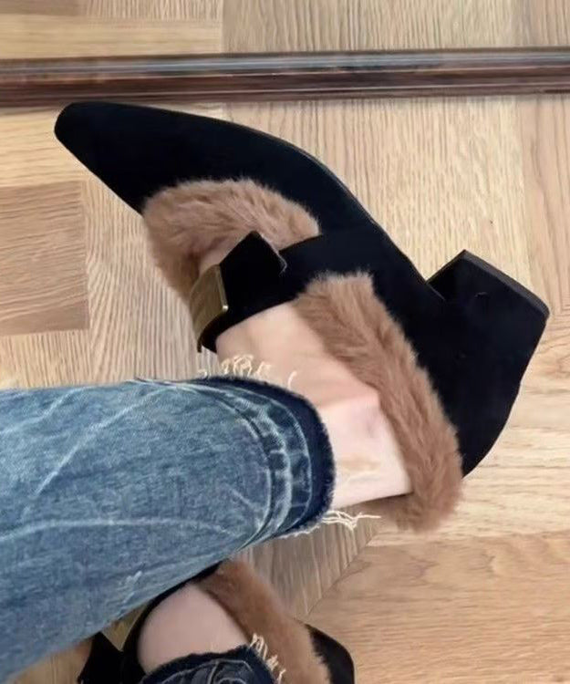 Brown Suede Splicing Chunky Heel Fuzzy Wool Lined Pointed Toe
