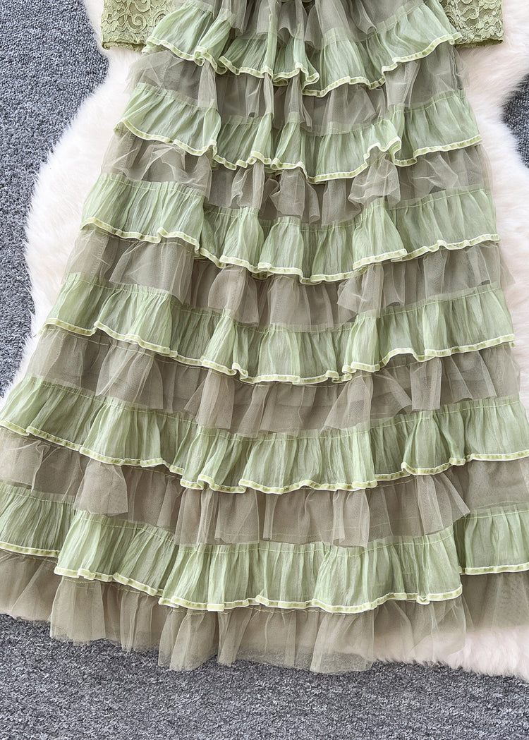 Beautiful Green Slash Neck Ruffled Patchwork Lace Party Dress Spring