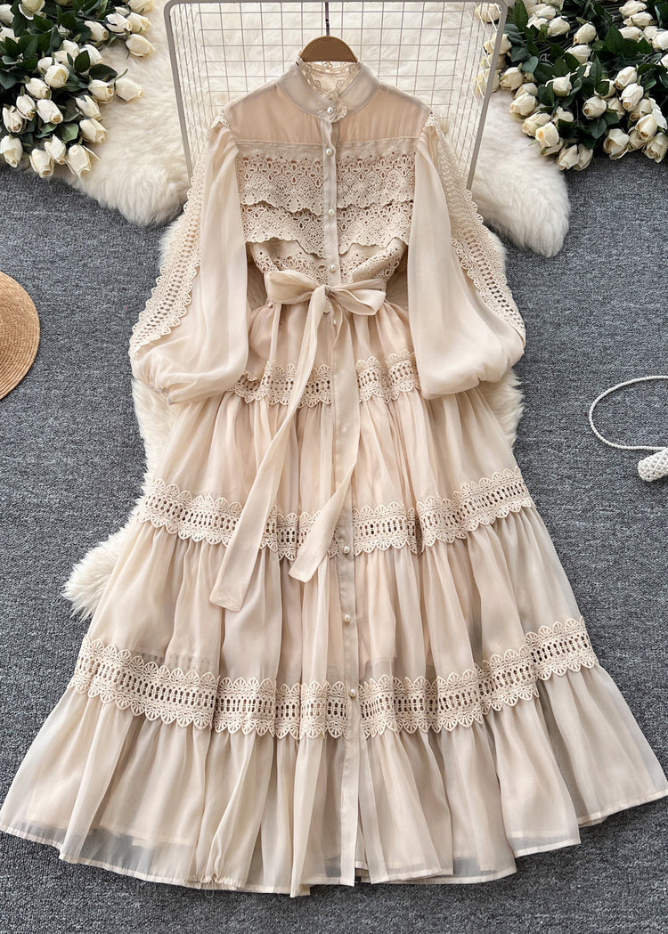 Classy Champagne Tie Waist Patchwork Lace Dresses Spring