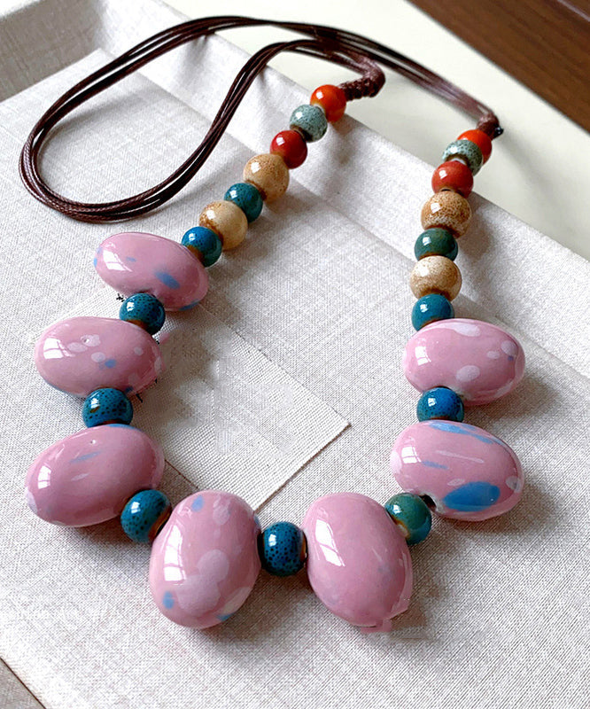 Art Pink Handmade Weaving Beading Ceramic Gratuated Bead Necklace