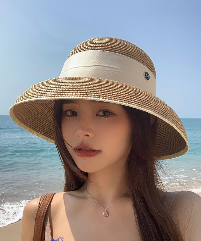 French Khaki Bow Straw Woven Holiday Style Beach Bucket Hat