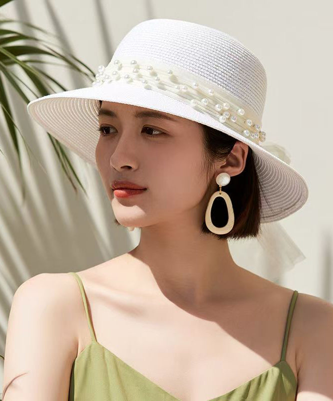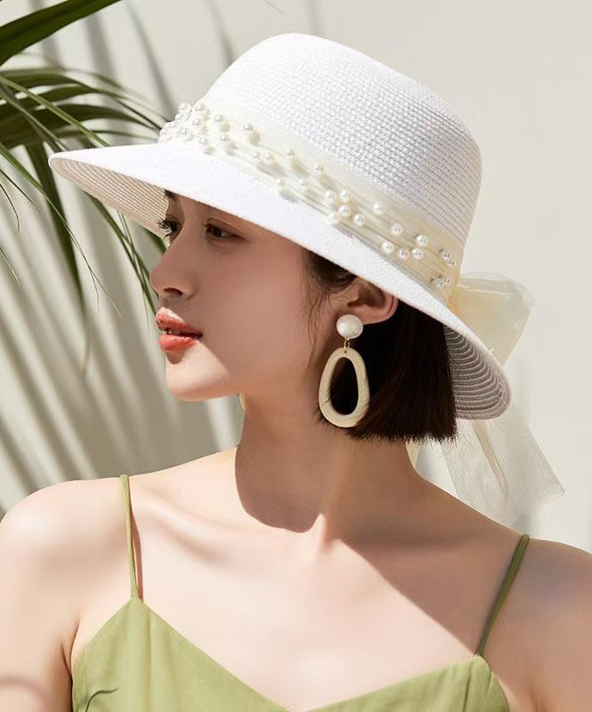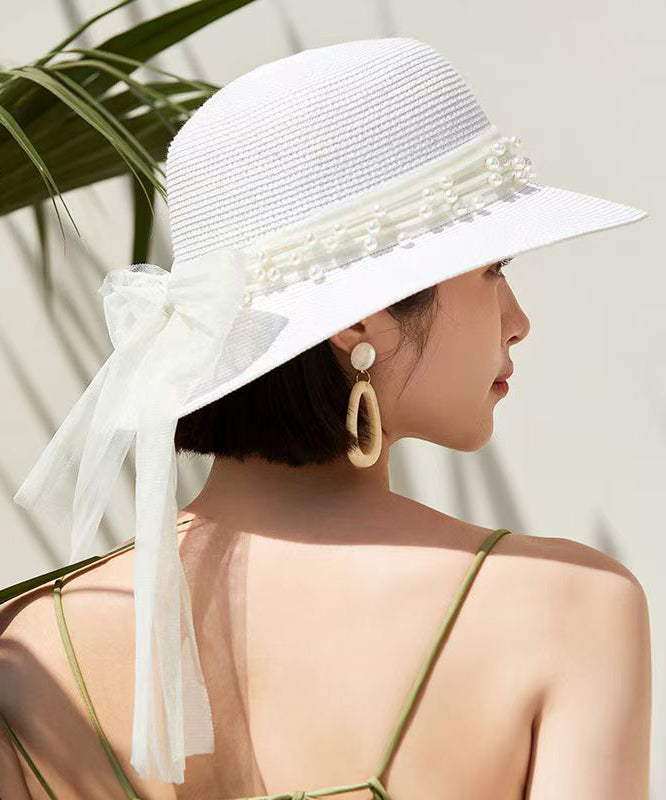 French White Bow Nail Bead Straw Woven Bucket Hat