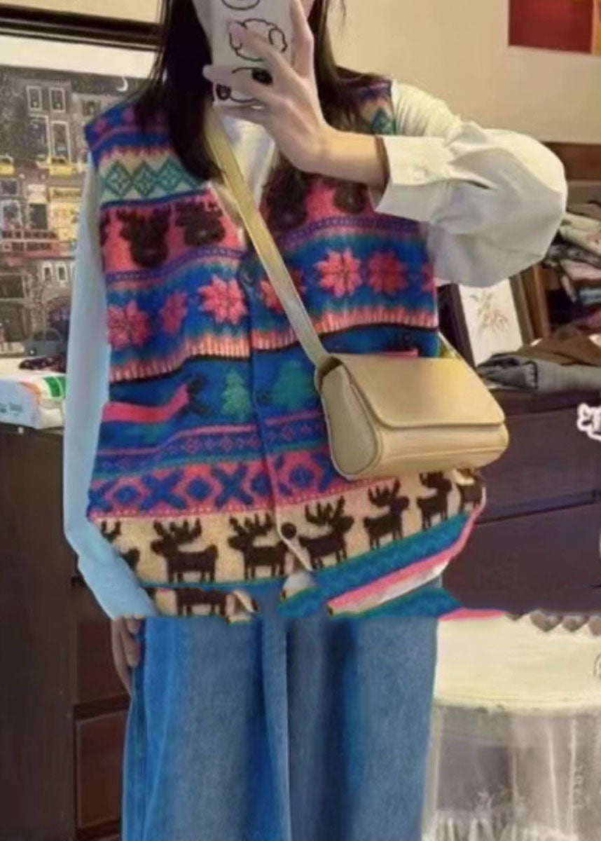 Modern Red V Neck Animal Floral Button Cotton Knit Waistcoat Fall