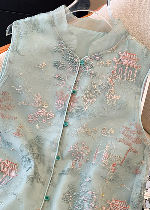 New Green Embroidered Button Tulle Waistcoat Sleeveless