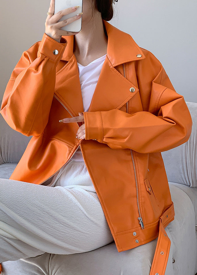 Unique Orange Peter Pan Collar Zippered Patchwork Faux Leather Jacket Fall