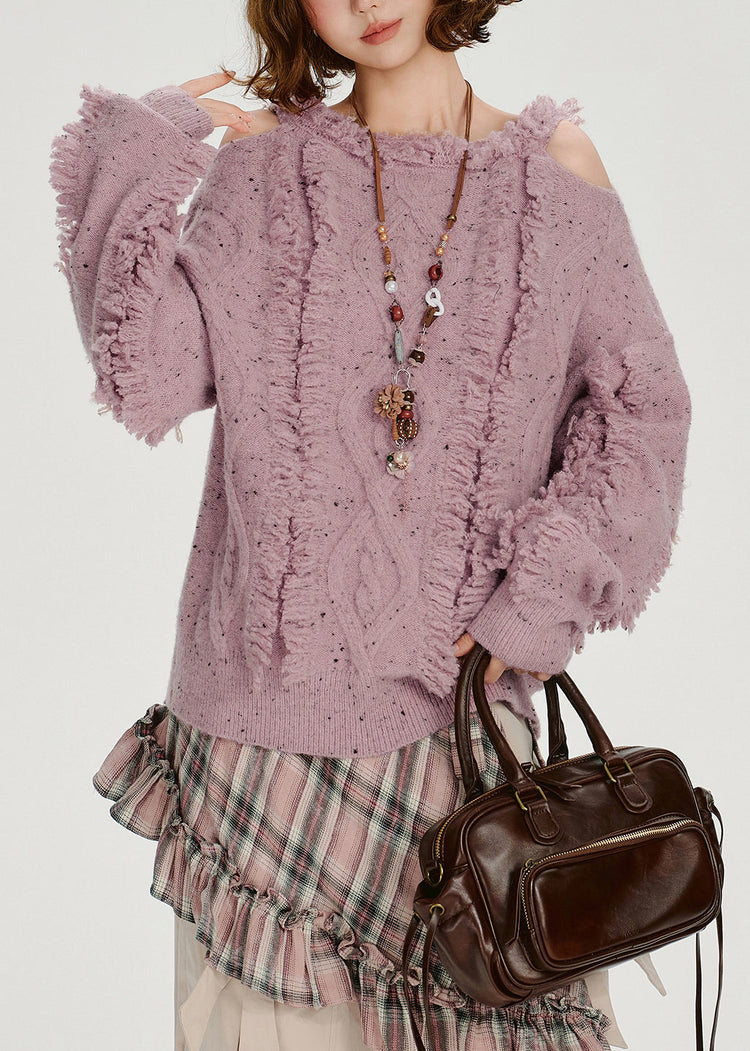 Italian Light Purple Cold Shoulder Cozy Fluffy Sweater Tops Winter