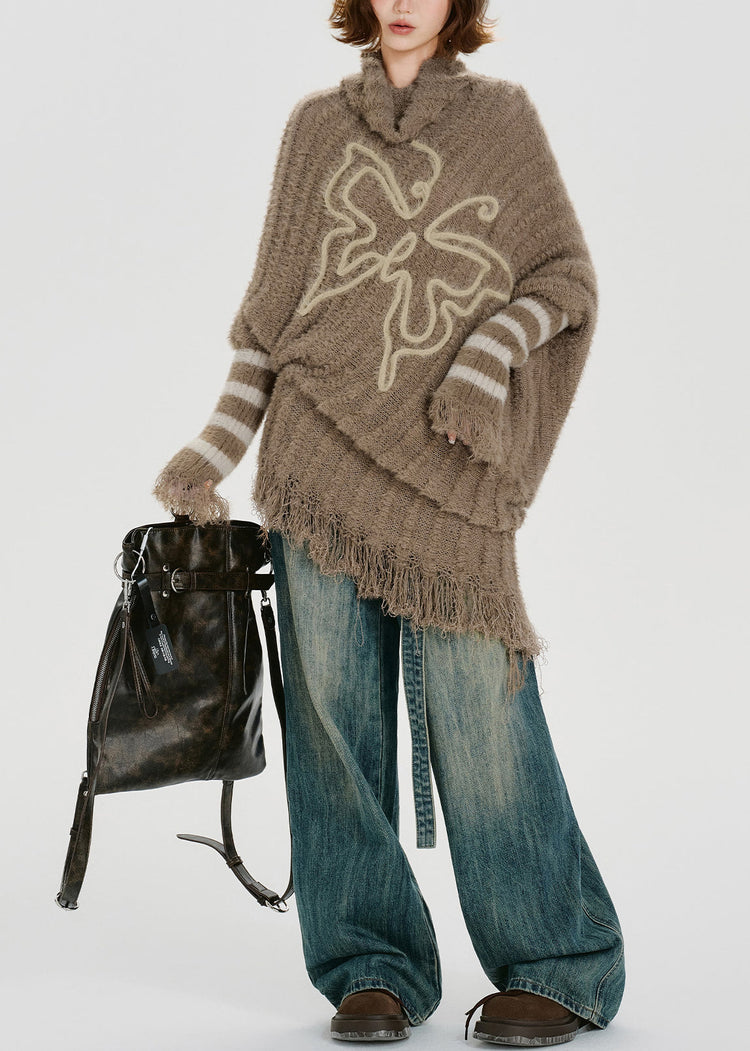 Unique Khaki Turtle Neck Tasseled Knitted Tops Batwing Sleeve