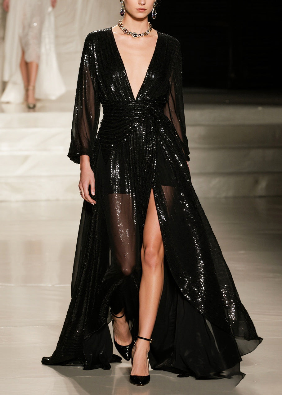 French Black Sequins Exra Large Hem Side Open Tulle Party Dresses Summer