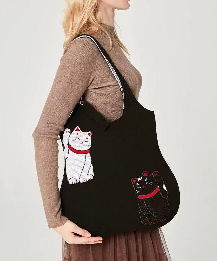 Classy Black Cat Embroidered Solid Durable Cotton Shoulder Bags