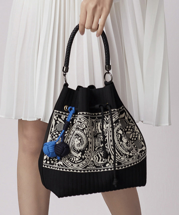 Art Black Jacquard Drawstring Cotton Pouch Handbag