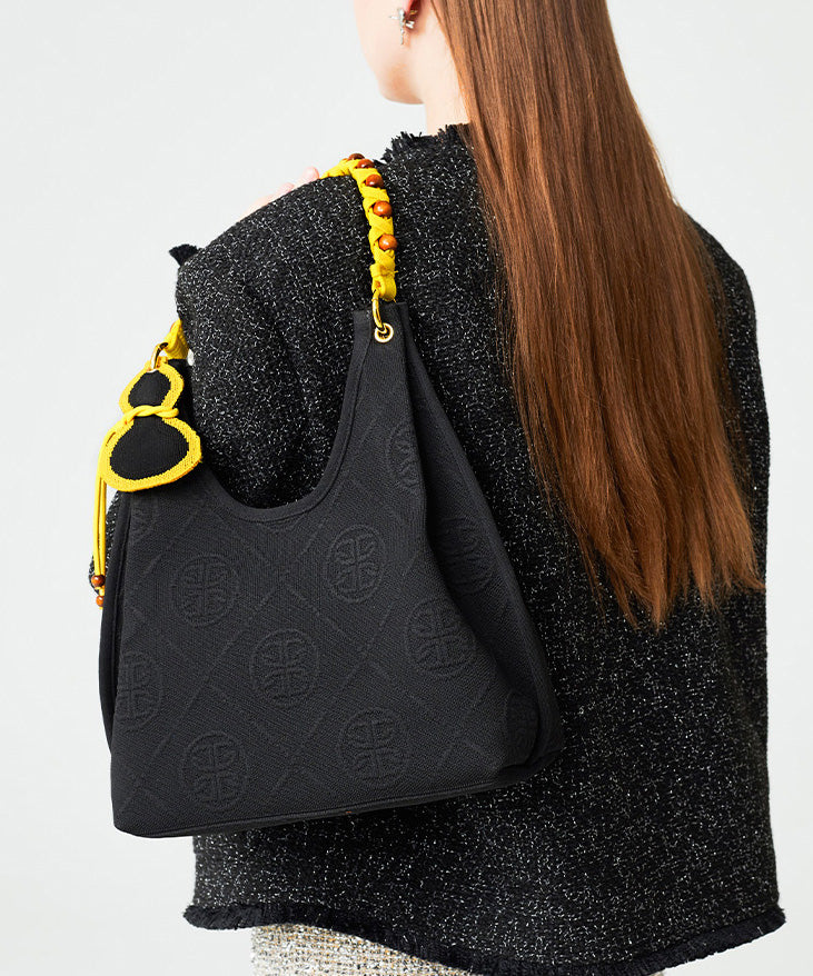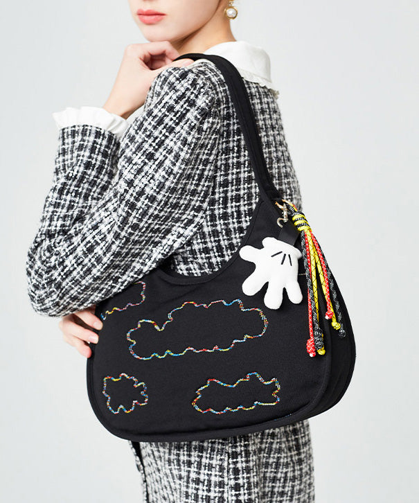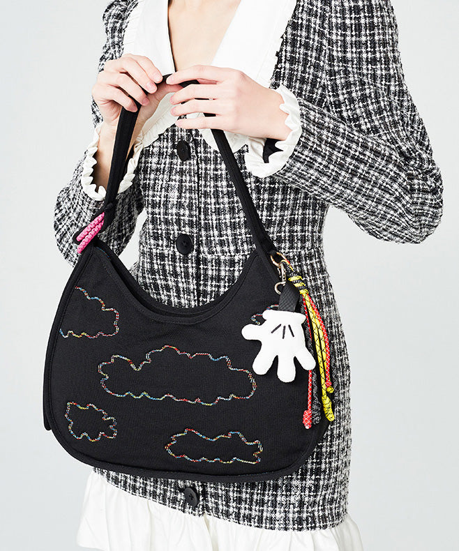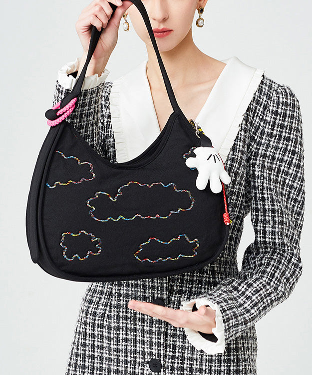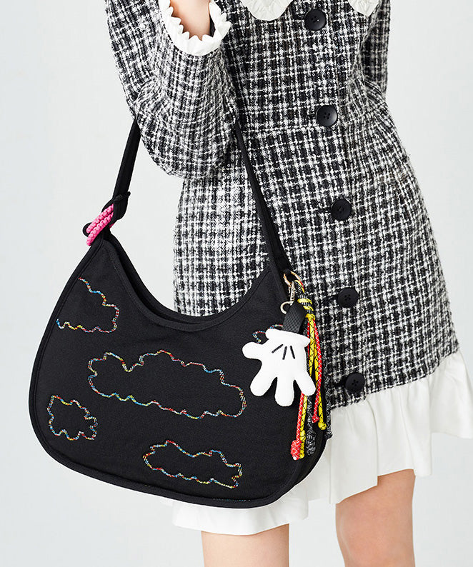 Fine Black Embroidered Pendant Decorated Cotton Hobo Bag