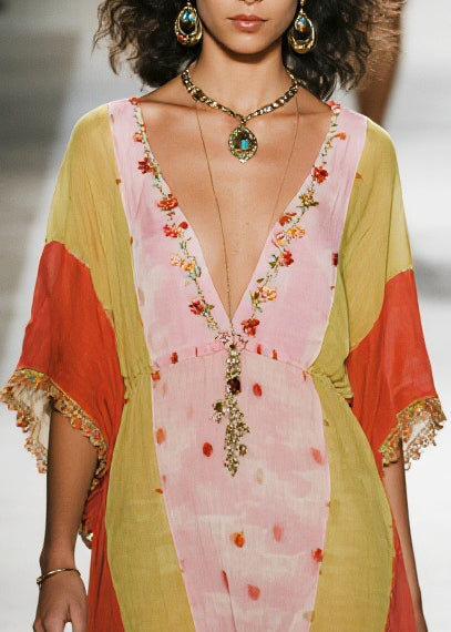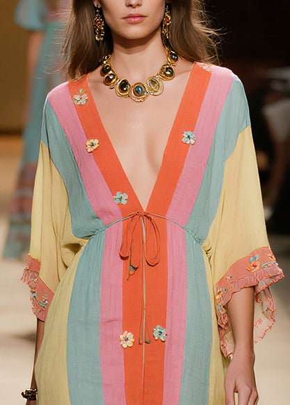 Bohemian Colorblock V Neck Striped Cotton Tunic Dresses Summer